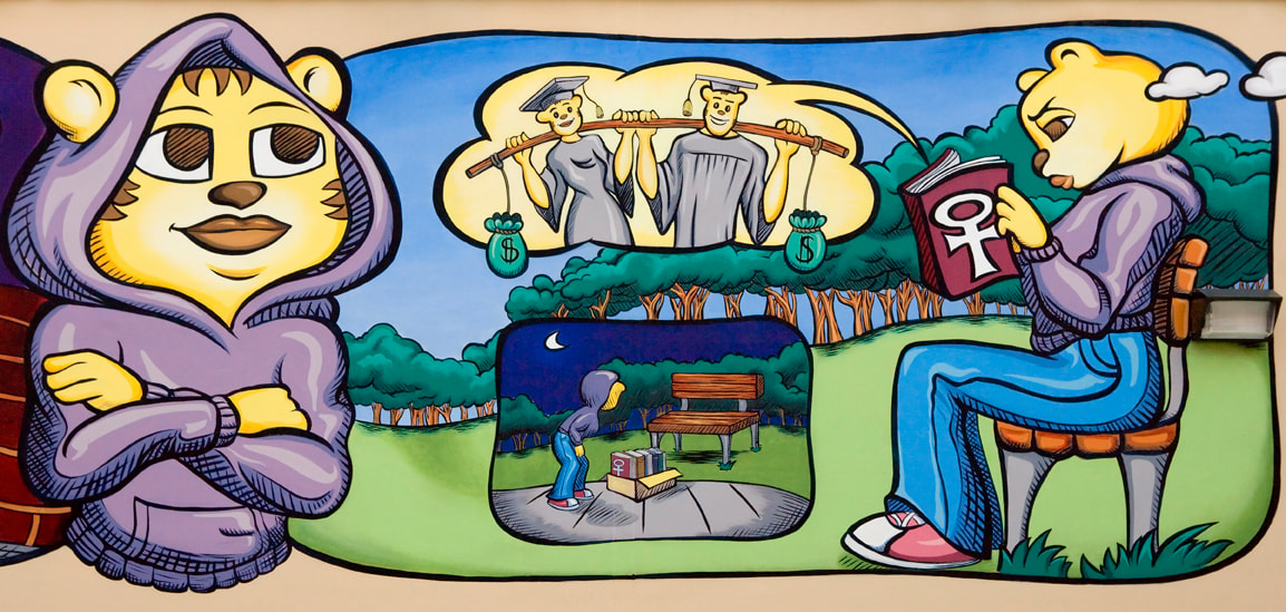 Artist's Statement: Kenya tells a personal story, through a simple comic-strip format, of a teen undergoing difficult changes. I was inspired to create the lead character by listening to detained young women and reading The Beat Within: A Weekly Publication of Writing and Art from the Inside. During the roundtable discussion with the detained youth at the old Juvenile Hall, many of the young women expressed their love of predatory cats like tigers and panthers. Their stories and opinions about their lives reminded me of my own painful adolescence. I took my pain, fused it with theirs, and decided to create a hopeful comic strip of a tiger girl named Kenya who overcomes her insecurity about becoming a woman.