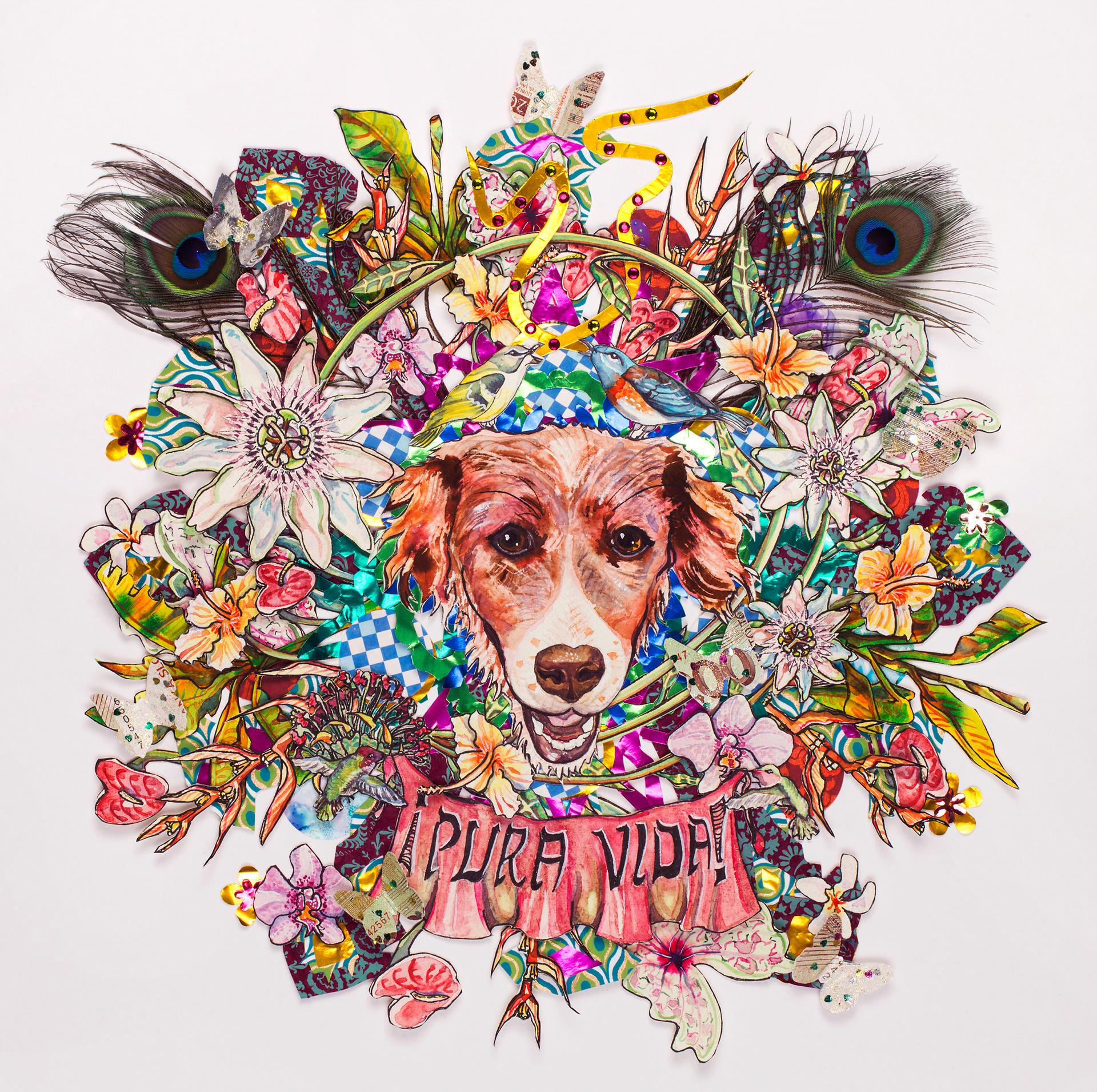 - Watercolor, paper, ink, glitter, feathers, and rhinestones on paper