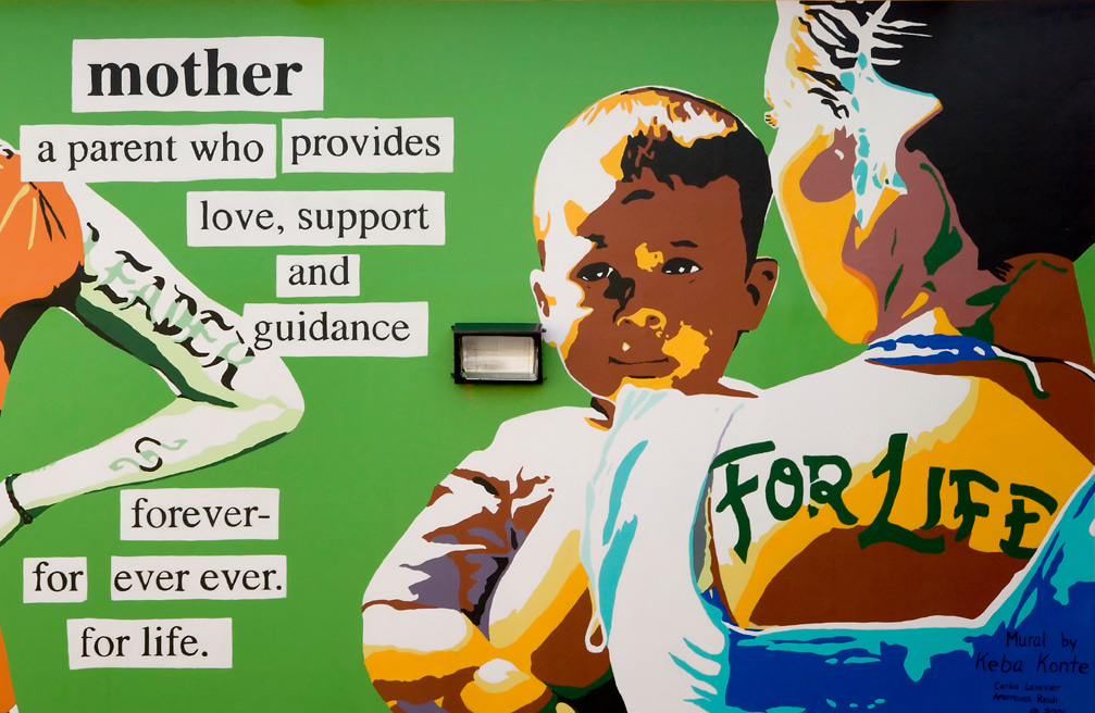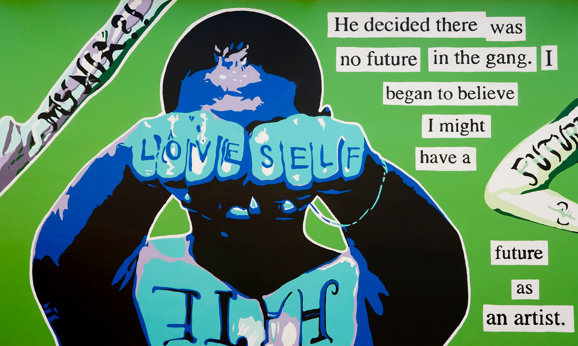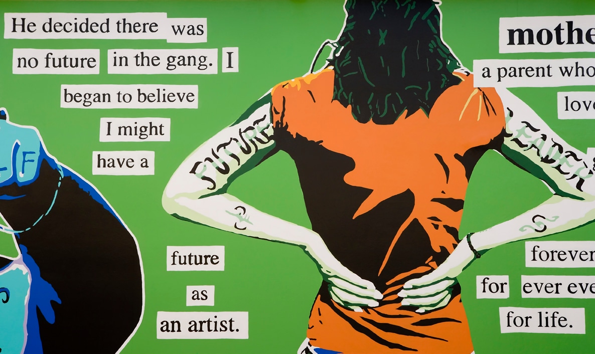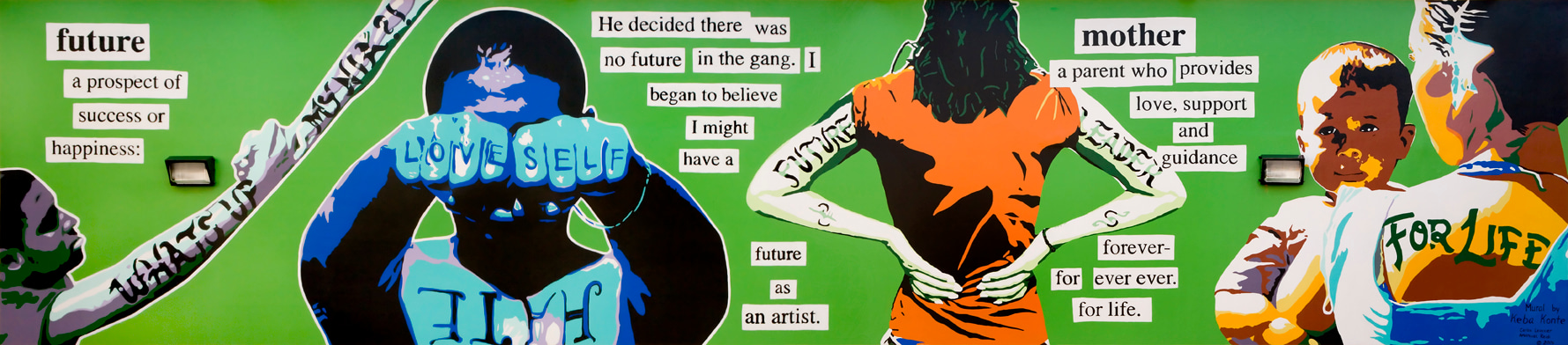 Artist's Statement: Tattoos are ancient, international, cultural icons. They are very familiar to detained youth due to their omnipresence in popular culture. It is not unusual for today’s teenager to have a parent who bears a tattoo. These murals serve as a powerful medium to convey thought-provoking ideas such as parenthood, self-respect, and sacrifice. Each individual who sees these words and phrases will have a different interpretation of them based on his or her own personal experiences. My hope is that the youth living with these murals will gain a deeper understanding of the words and their concepts as time passes.