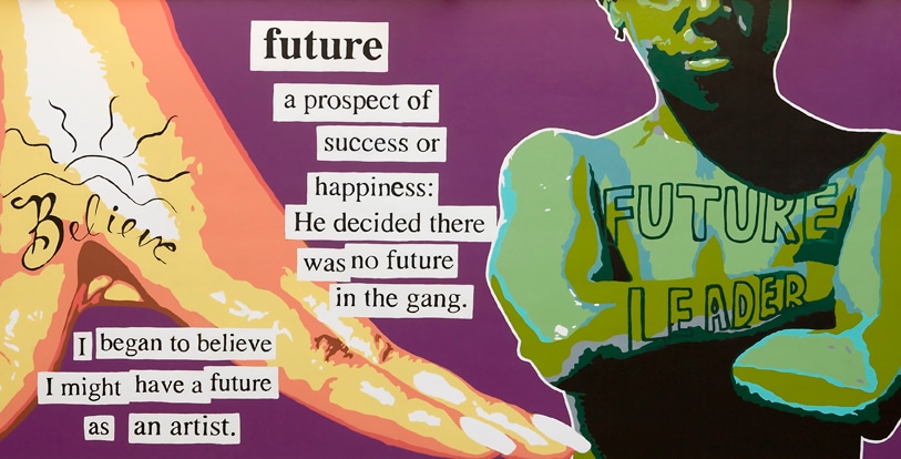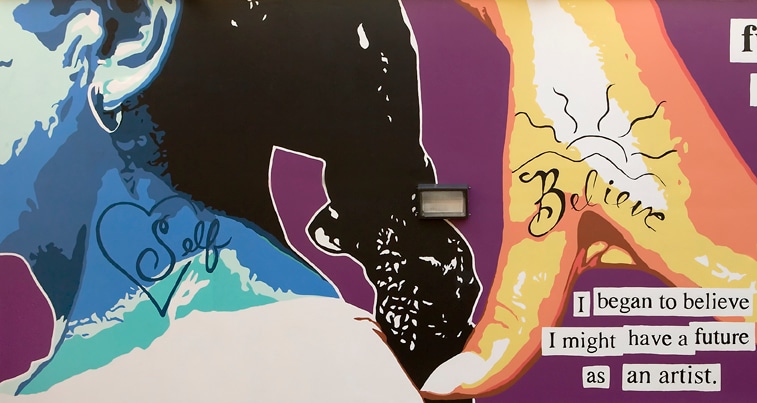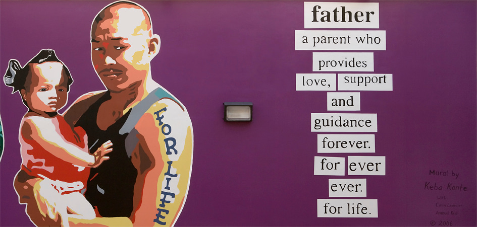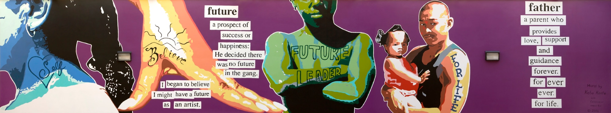 Artist's Statement: Tattoos are ancient, international, cultural icons. They are very familiar to detained youth due to their omnipresence in popular culture. It is not unusual for today’s teenager to have a parent who bears a tattoo. These murals serve as a powerful medium to convey thought-provoking ideas such as parenthood, self-respect, and sacrifice. Each individual who sees these words and phrases will have a different interpretation of them based on his or her own personal experiences. My hope is that the youth living with these murals will gain a deeper understanding of the words and their concepts as time passes.