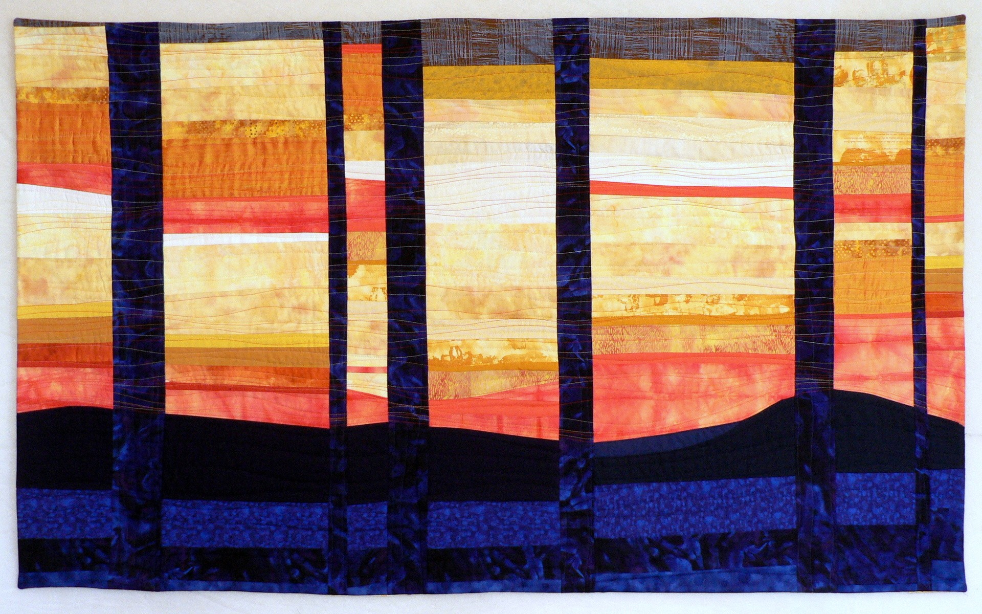 - Cotton, silk, hand dyes, batting, machine pieced and quilted