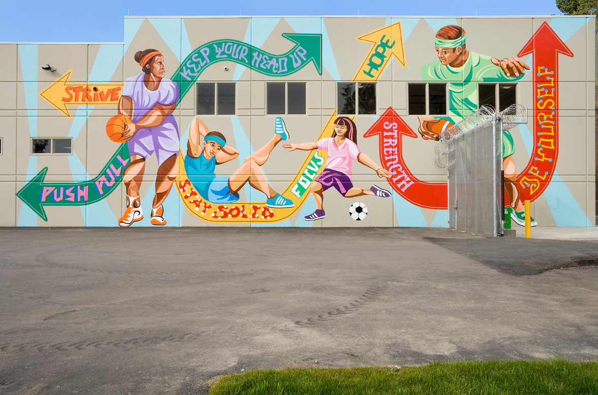 Artist's Statement: Recreation is the theme of our mural, which is composed of four figures — all engaged in a sport or exercise activity — linear design elements, and phrases and lettering designed by youth detained at the old Juvenile Hall. Rather than present specific individuals, we designed the figures to represent people of various cultures playing and exercising together, activities that will take place in the recreation field. The bright colors, arrows, and linear elements define an active space, and the diagonal lines accentuate the building’s architectural qualities. The phrases, like the directional arrows based on traffic signs, present positive, inspirational messages. We hope the viewers, the detained youth, will feel the joy of exercise as a way to stay healthy in any situation.