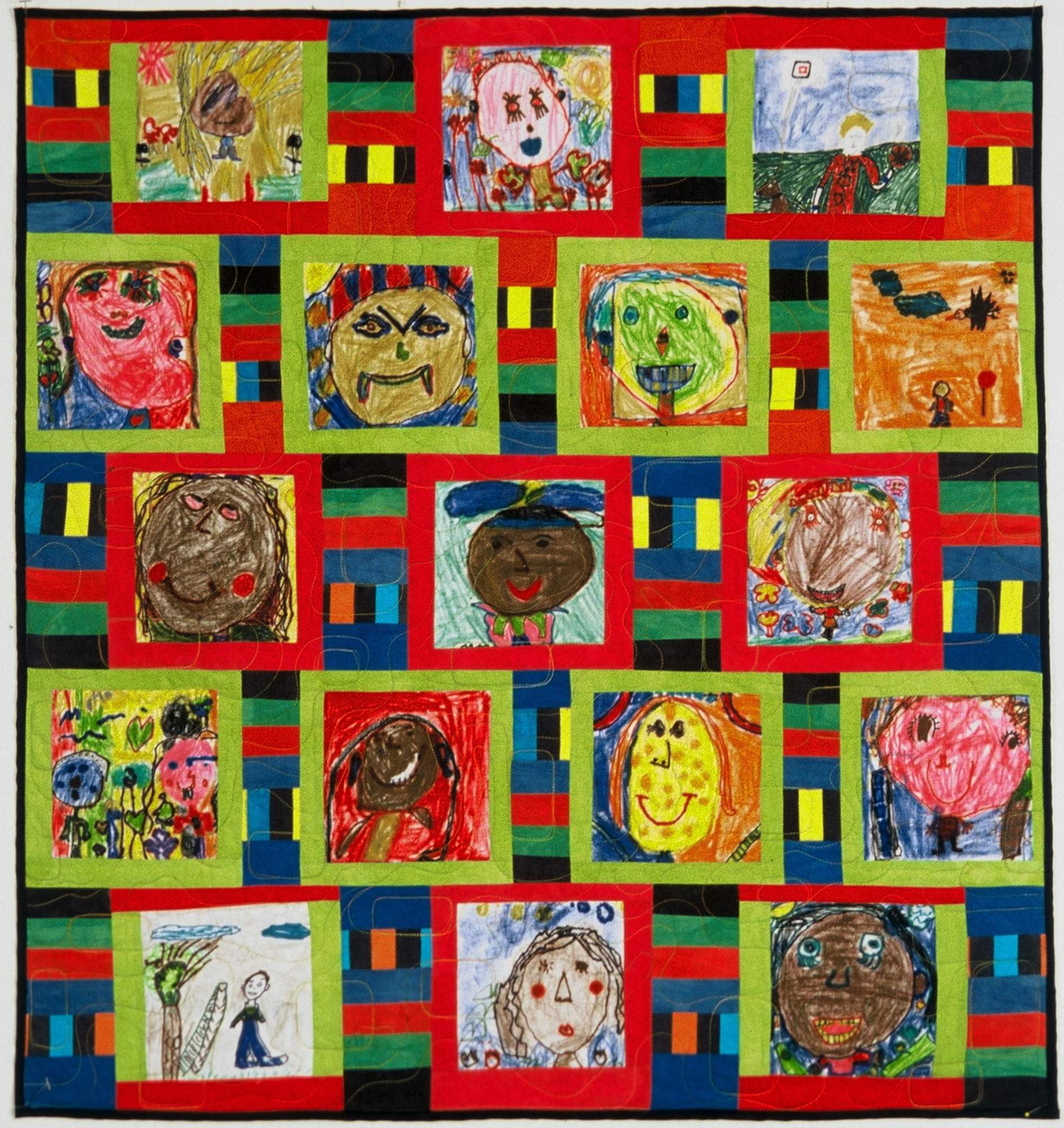 Artist Statement: After years of students drawing themselves on rectangular pieces of paper and fabric students were given squares of fabric and asked to turn it 45 degrees and then draw their self portraits inside the ‘diamond’ shape. In quilting this is called using a square on point. Quite a few students could not make the transition leaving me with several squares that did not fit into the quilt that we had planned. I used scraps that I had saved from other quilts to piece this quilt together.