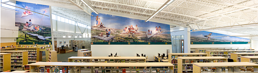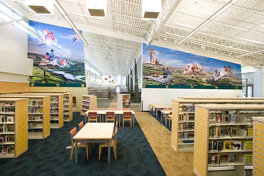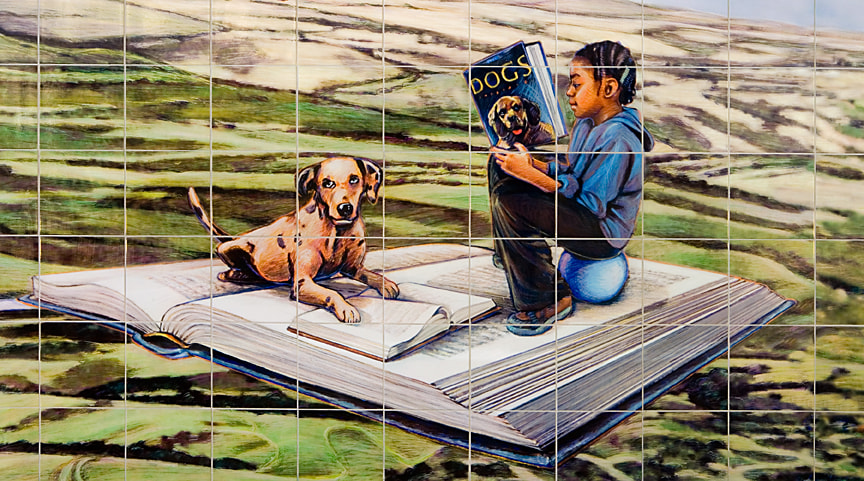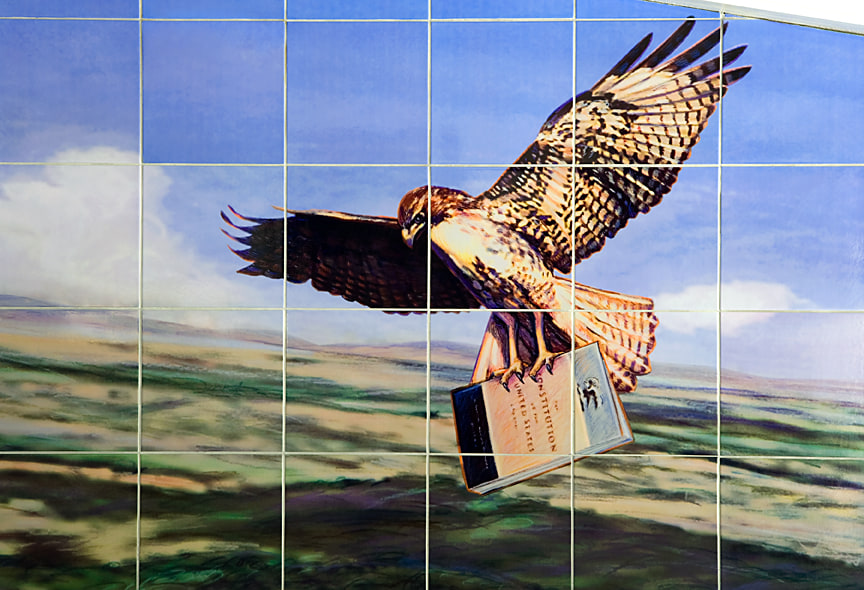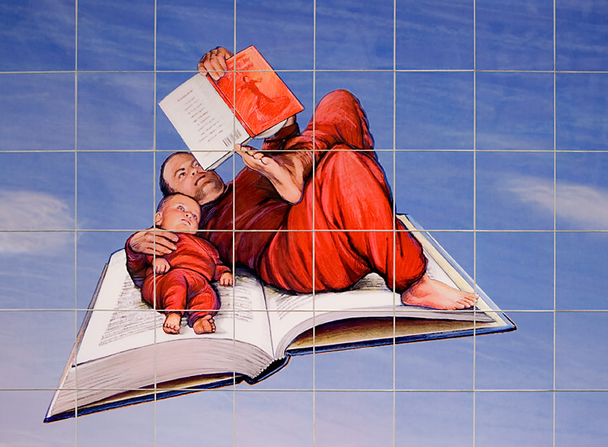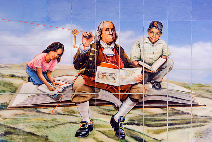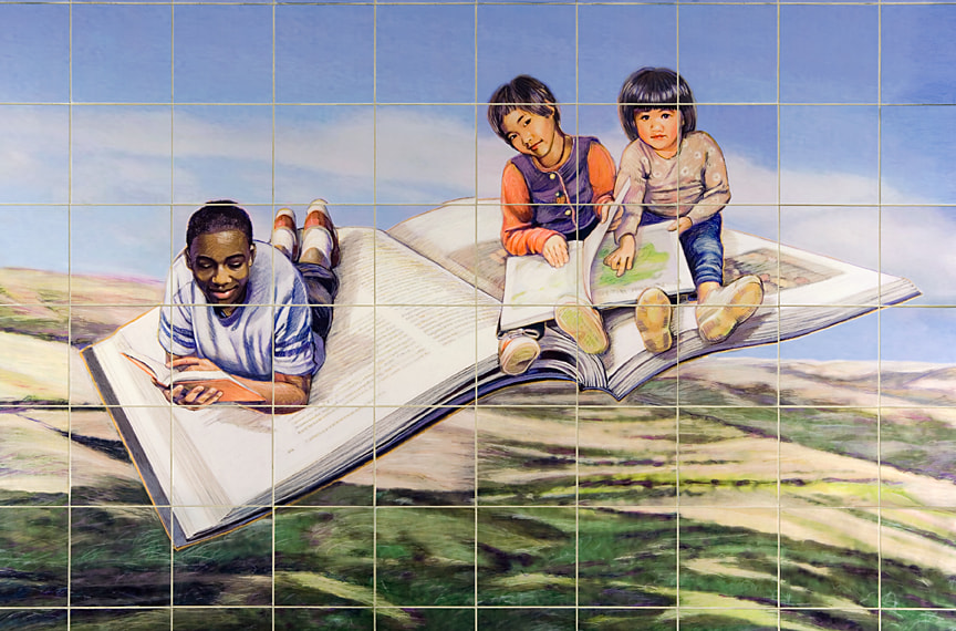 Artist's Statement: "As the title suggests, the mural celebrates the human imagination and our quest for the acquisition of information and ideas. Implicit in the quest is freedom in other areas. Along with "Free Books," the freedoms that all Americans are guaranteed and hold dear are enumerated at the bottom of the mural in low-relief lettering. Benjamin Franklin is a central figure because, as the "Father of American Liberties," he well understood how important free lending libraries were, and remain, as supports to and stimulation for the other freedoms contained in our constitution's "Bill of Rights." Franklin recognized that the free exchange of ideas is necessary for maintaining a citizenry capable of fostering and continuing our democracy. He and the children on their magic-carpet books fly over the landscape of Castro Valley. Franklin holds a kite (referencing his interest in science and experiments with electricity) with a design that represents the original American flag and a rainbow tail signifying the cultural diversity that is a hallmark of our area. The border is handmade carved-relief tile. The circular medallions show native flora: sticky monkey, Douglas iris, checkerbloom, Ceanothus, western columbine, yarrow, coyote mint, and blazing star. The phrases include: free speech, free people, free books, free thinking, free assembly, free press, free electronics, free education, and free country."
