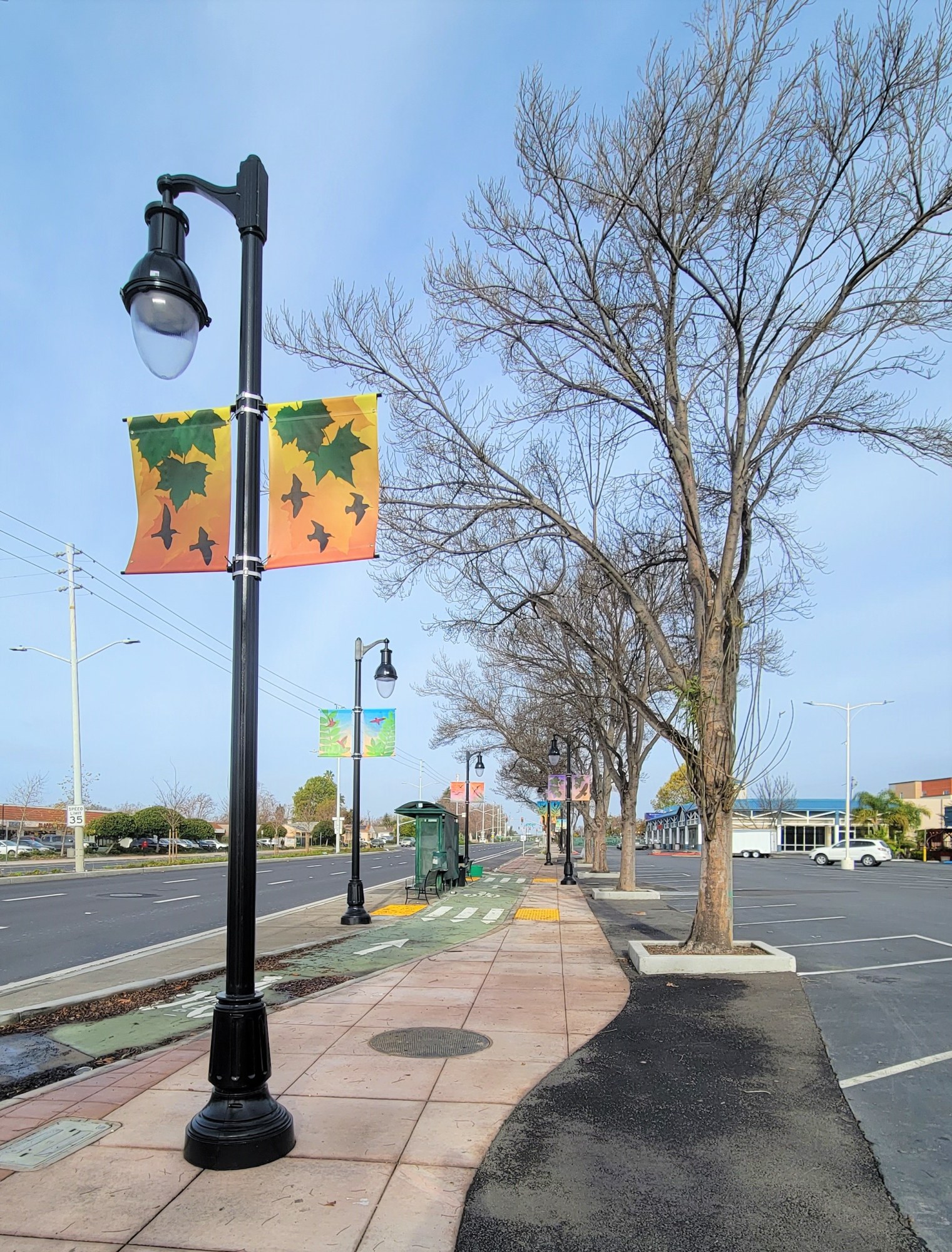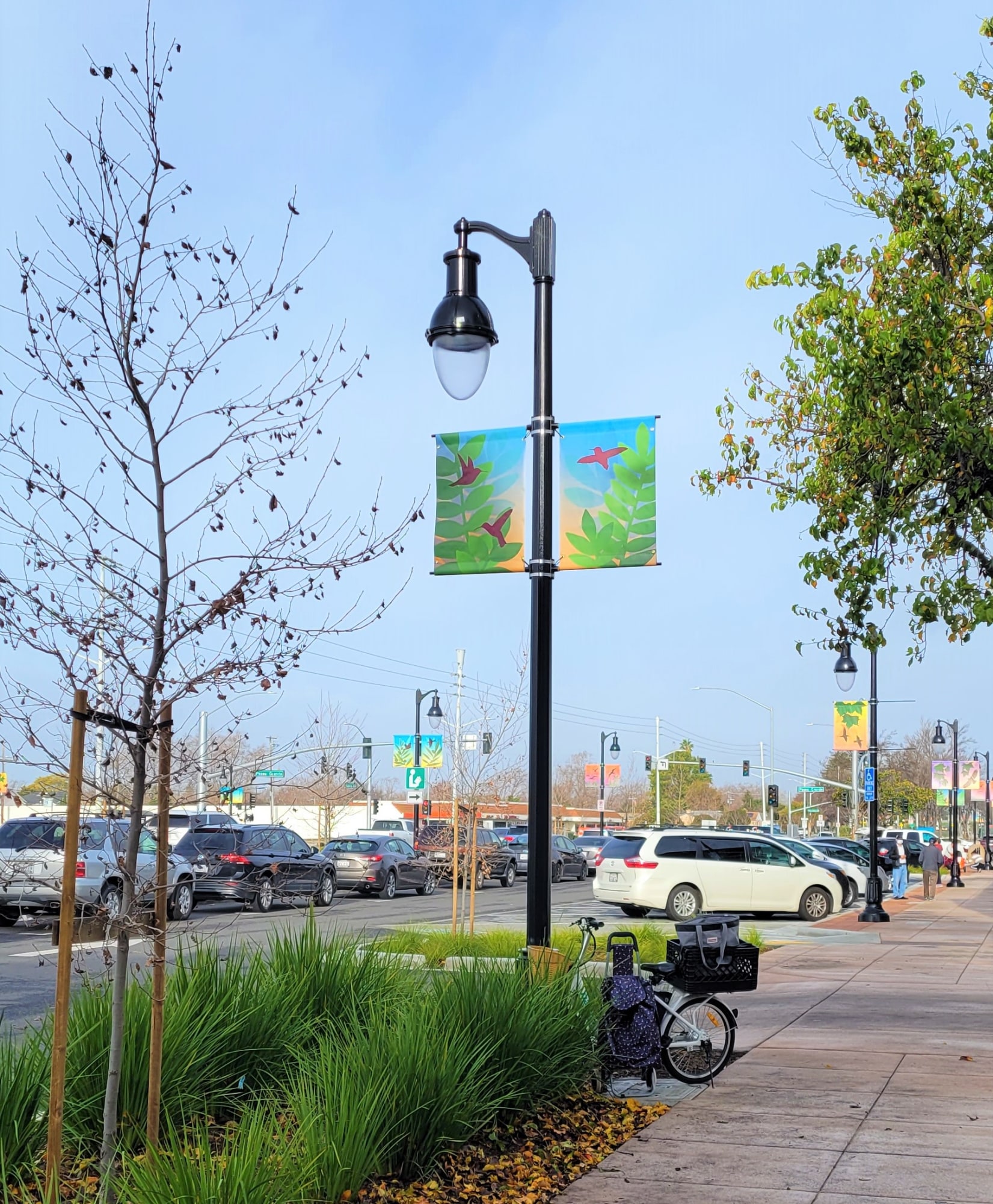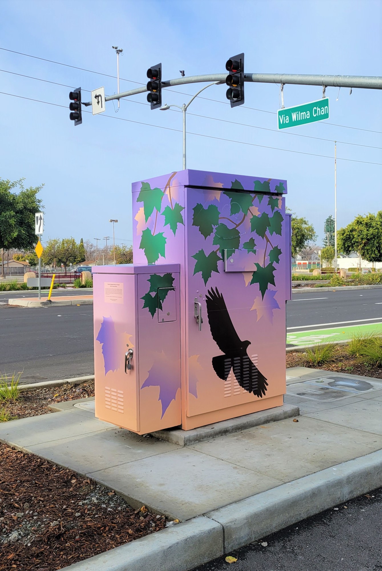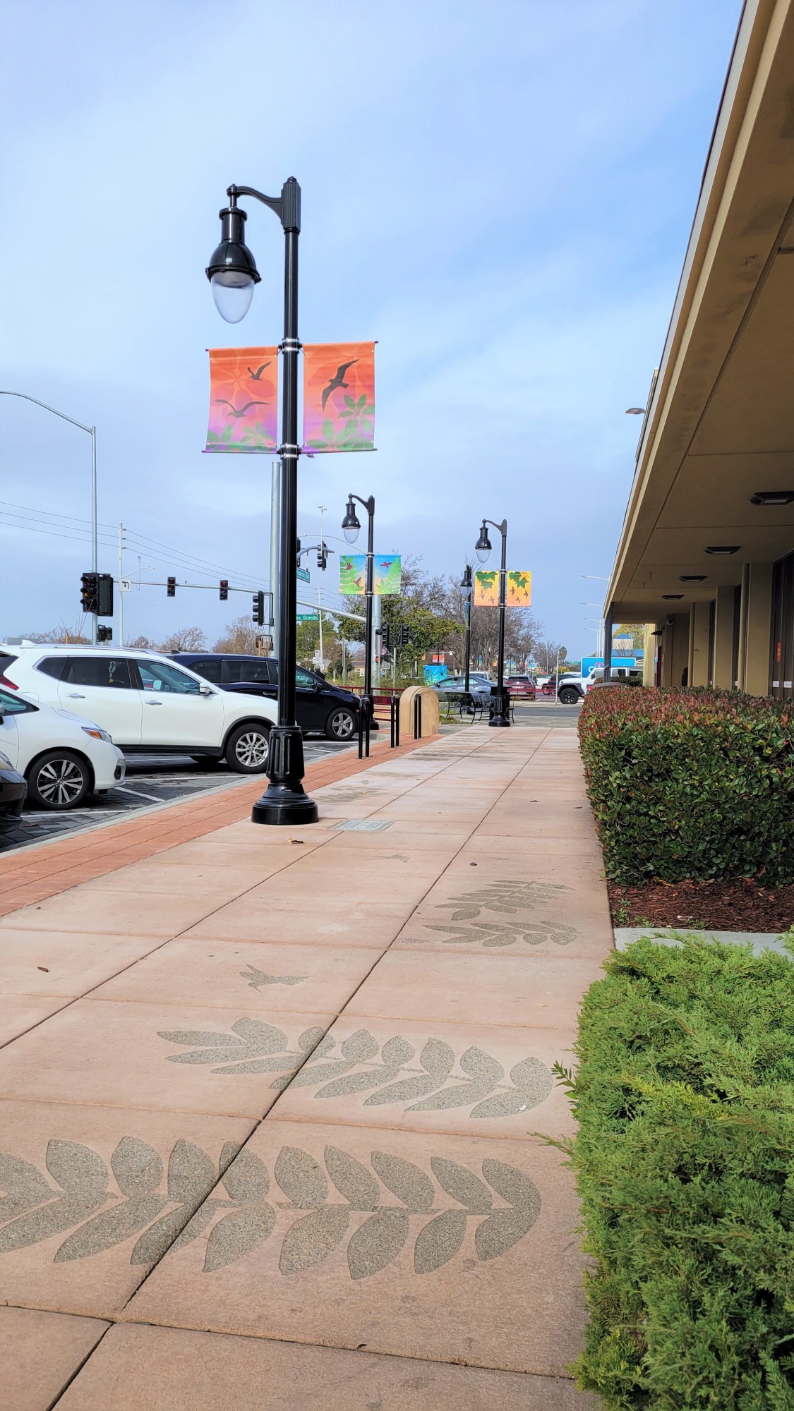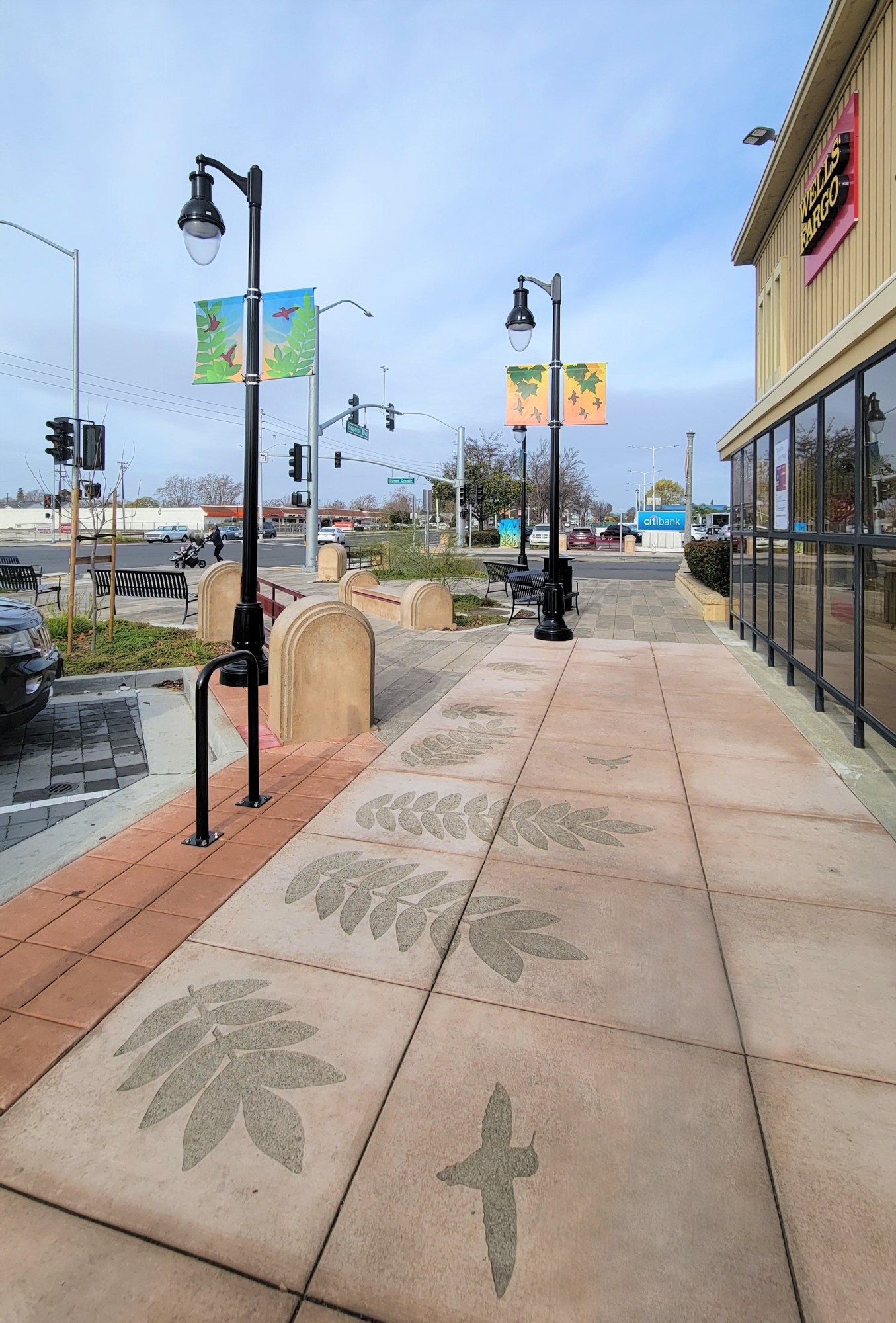 Artist Vanessa Marsh was selected through an open, competitive process by a Selection Committee of community members who live and work in San Lorenzo. The overall theme of the artwork is “The Sky Above and Below.” The artwork references the connections and shared experiences of the local natural environment of San Lorenzo. Marsh’s designs are based on her photographs of San Lorenzo. Using the photographs, Marsh created handmade silhouette paintings of plants and birds common to San Lorenzo including hummingbirds, hawks, blackbirds, gulls, sandpipers, and sycamore, olive, and honey locust trees. The silhouetted paintings were then digitized and used to make metal stencils for sandblasting on the concrete sidewalks along Hesperian Boulevard and featured on street banners and utility boxes.