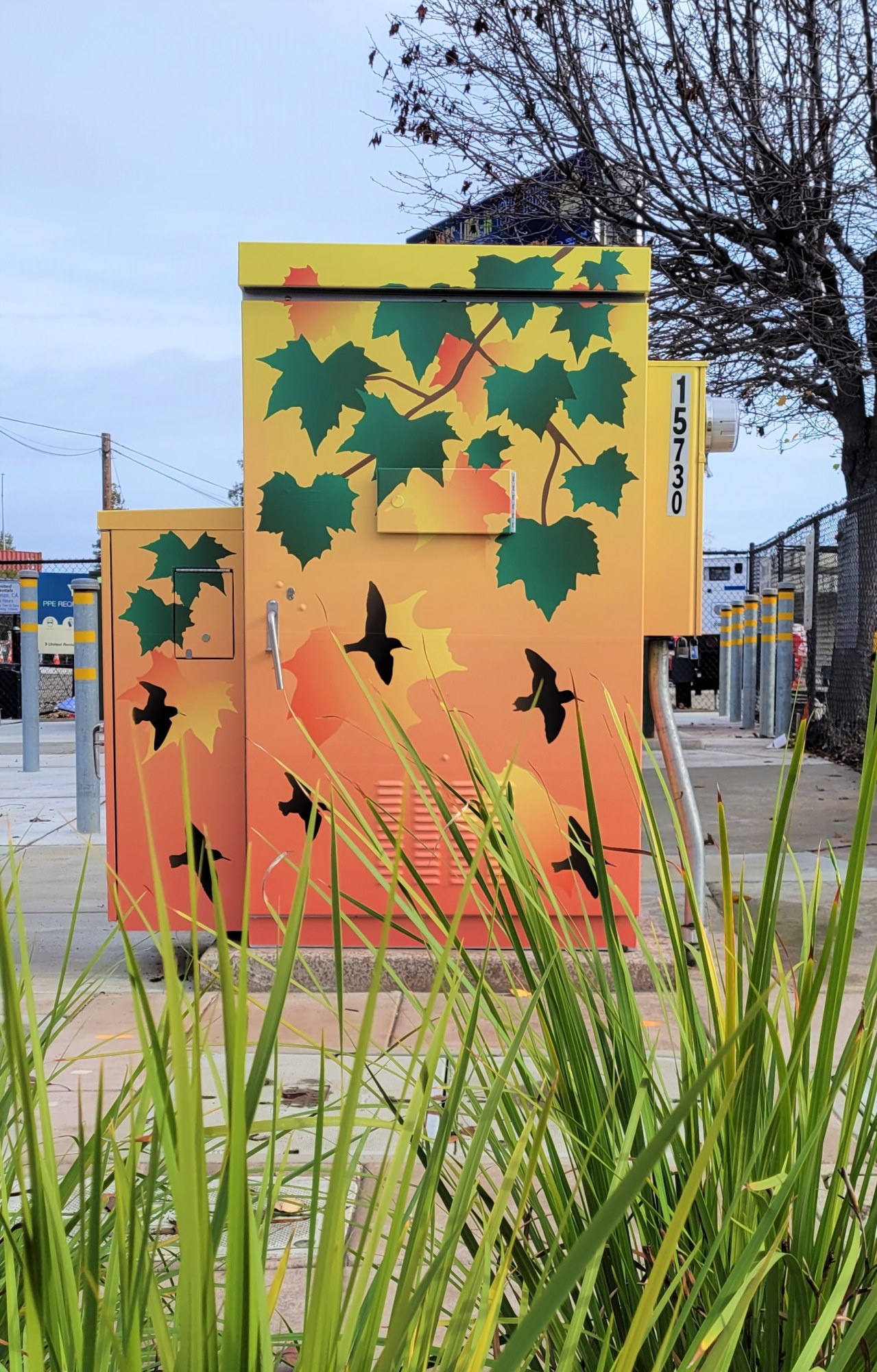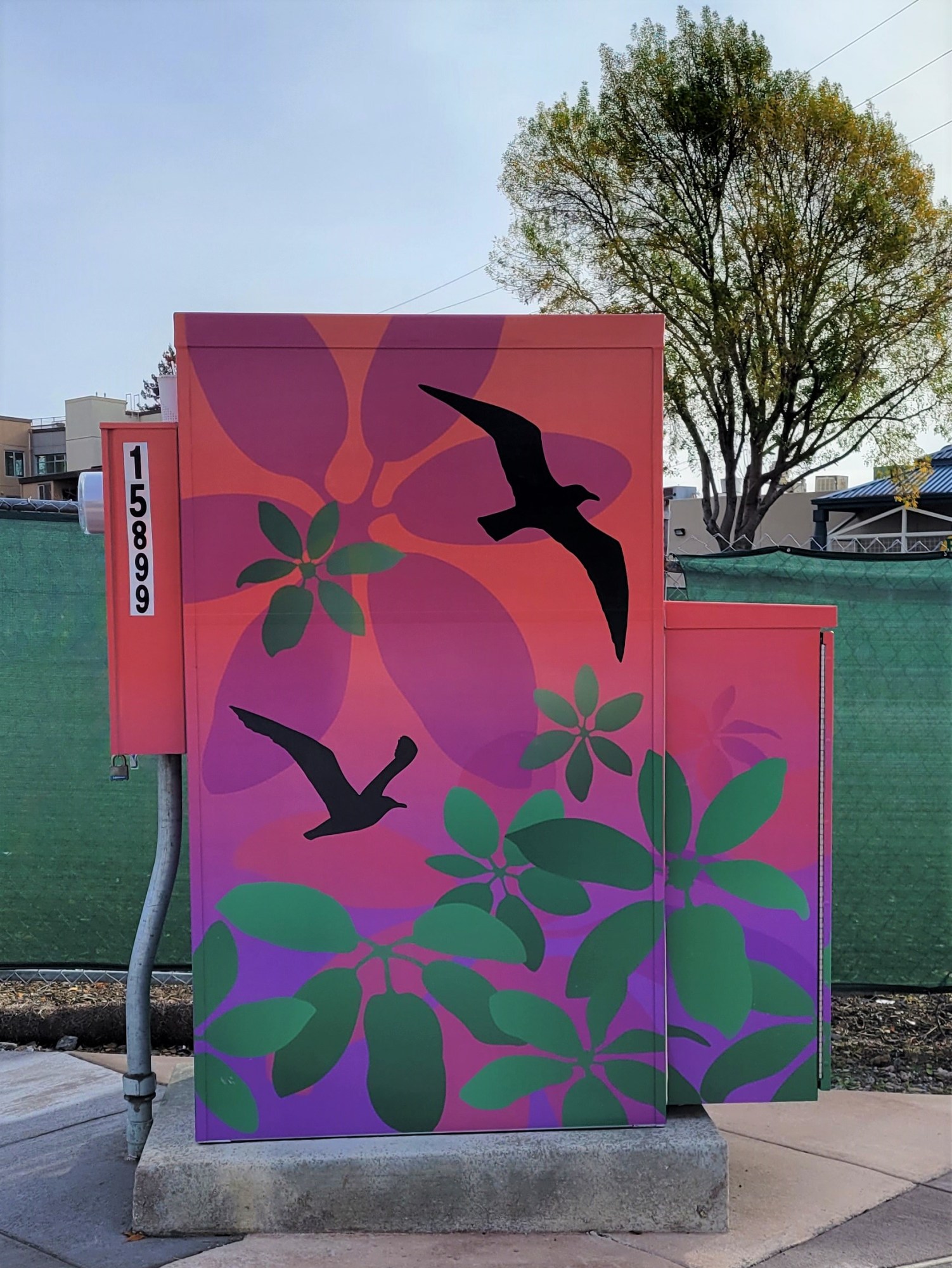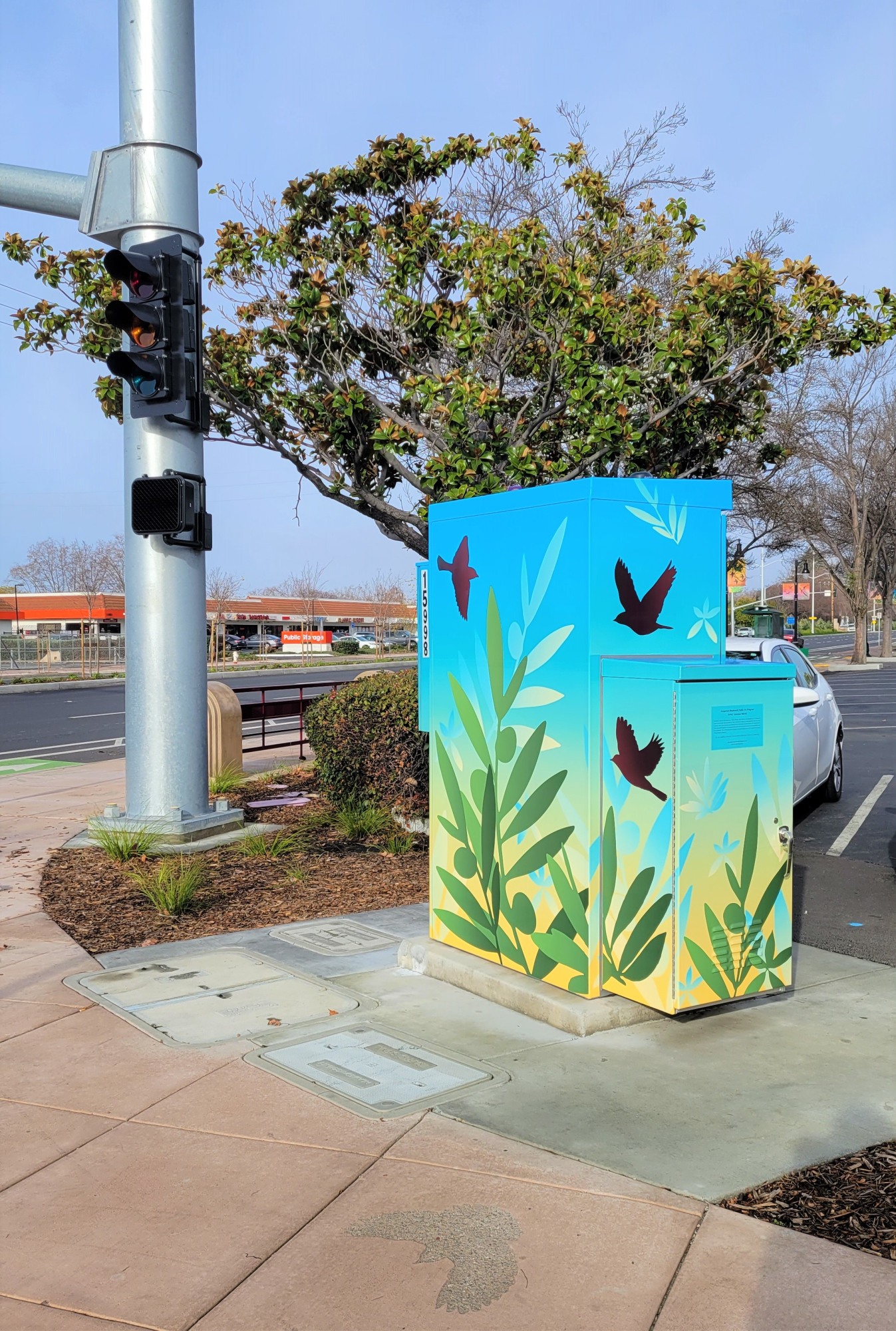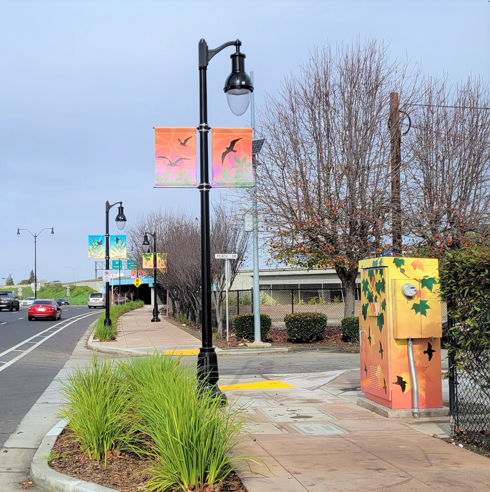 Art Banners & Utility Box Wraps: Marsh’s colorful compositions of birds flying through lit skies are featured on the street banners and utility box wraps. The Arts Commission partnered with the Alameda County Economic & Civic Development Department to fabricate and install the banners as part of the ECD’s Banner Program in unincorporated Alameda County. The Arts Commission partnered with the Alameda County Public Works Agency to fabricate and install the utility box wraps as part of the Utility Box Art Program in unincorporated Alameda County. The art banners and utility box wraps are temporary aspects of the project.