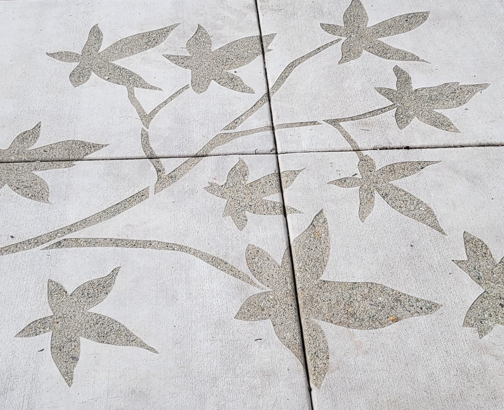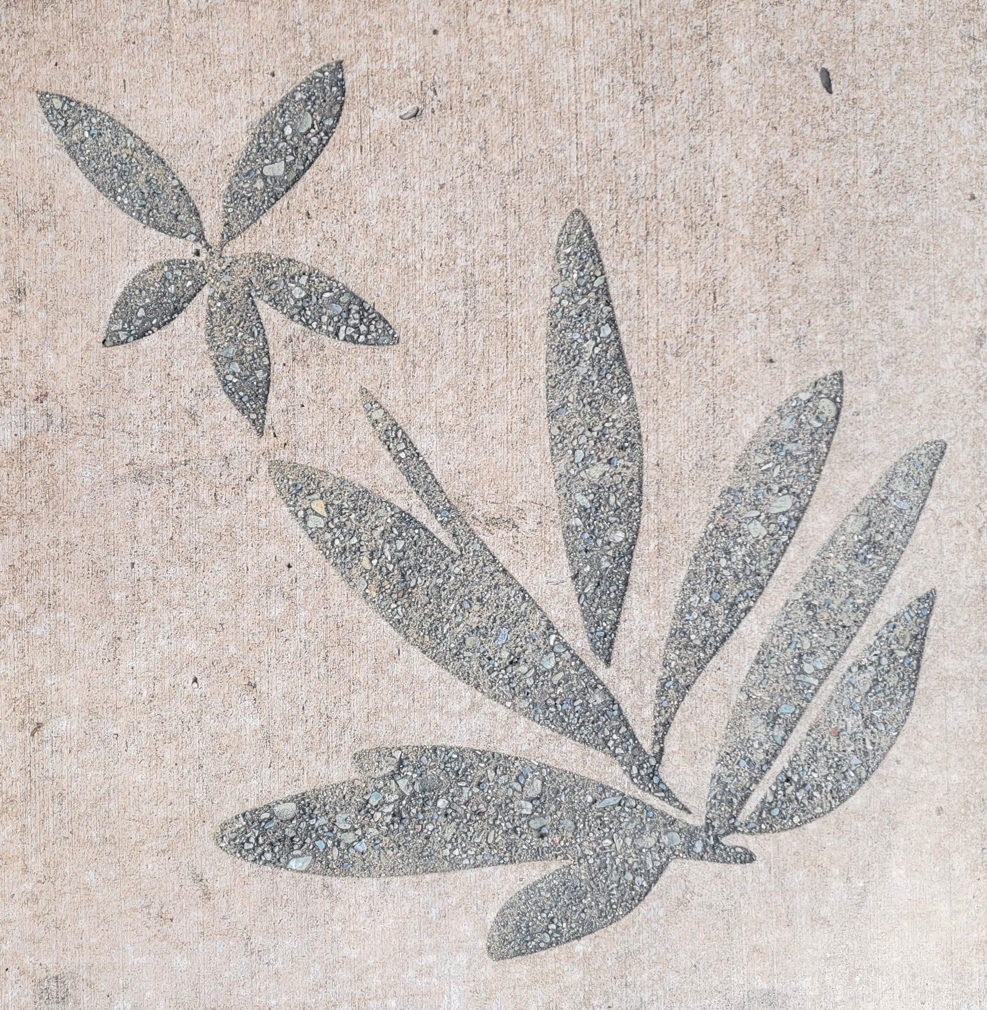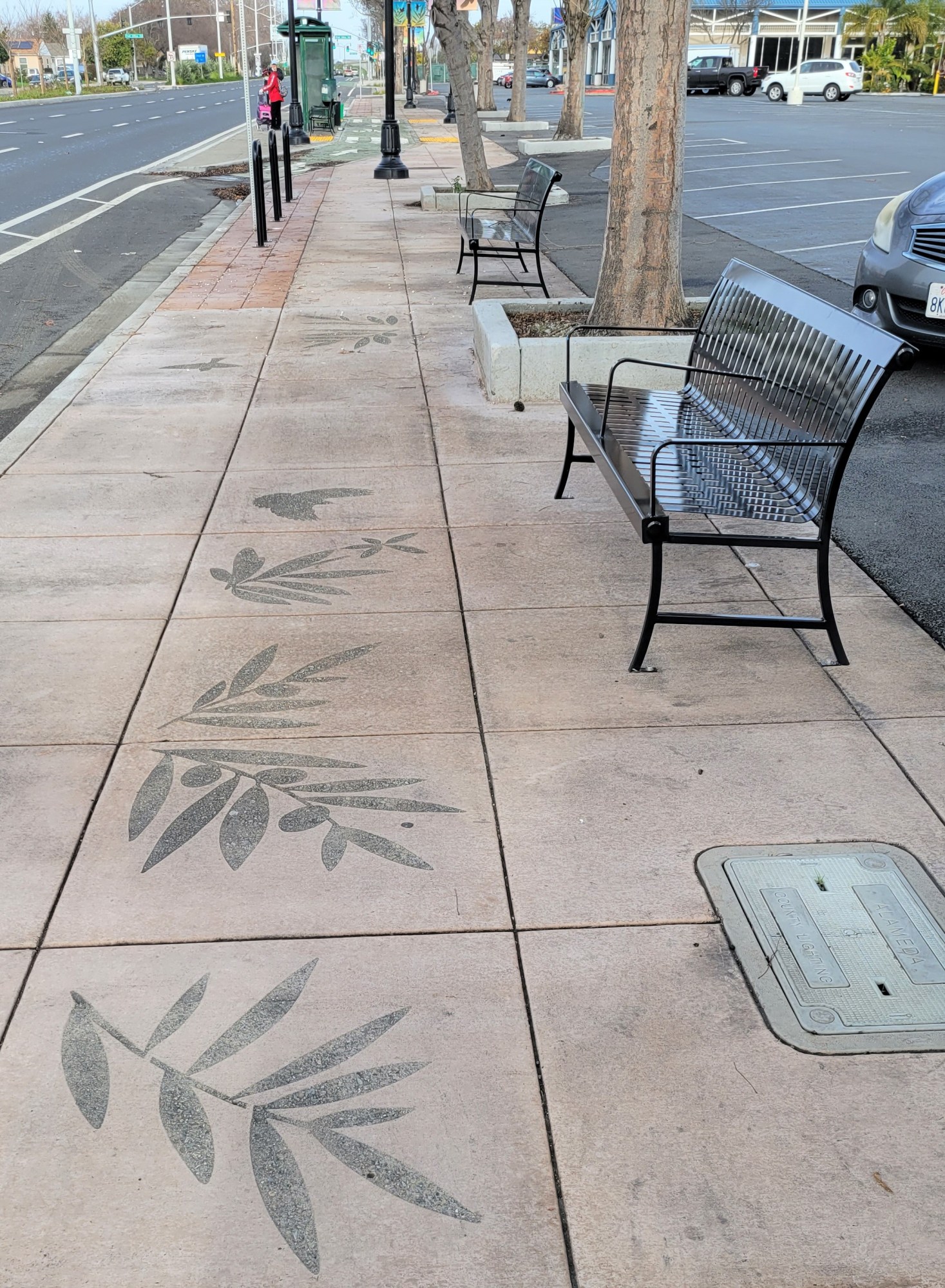 Stencil-Sandblasting: Artist Vanessa Marsh created 50 unique designs based on her photographs of San Lorenzo’s trees, plants and birds. She created silhouette paintings from her photographs and then digital files were created and used to make metal stencils. The stencils were then used to sandblast the designs into the concrete. The designs are situated at eight different locations along Hesperian between Post Office Road and Via Mercado. Tree branches, leaves and birds in flight create a sense of movement and interest along the sidewalks. The placement of the designs is intended to promote exploration of the pavilions and shopping areas.