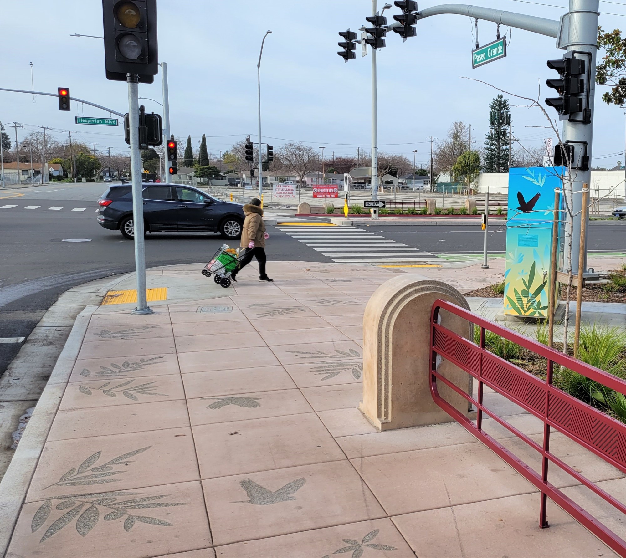 This artwork was created as part of the Hesperian Boulevard Corridor Improvement project. The Hesperian Boulevard Corridor Improvement Project extends from the I-880 freeway overpass to A Street in the San Lorenzo community in unincorporated Alameda County. Motorists, pedestrians, bicyclists, transit riders, and residents in the San Lorenzo community will enjoy a revitalized, safe, and accessible commercial corridor.