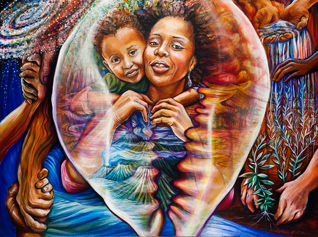 gesture or exchange. The figures are embraced by elements of the natural and healing world. Juana Alicia describes the painting Universal Connection as “representing the human connection with a balanced universe. The mother and child within the cowrie shell, the hands supporting and embracing each other, and hands watering and tending the crops, all express the energy of connection and cooperation.”