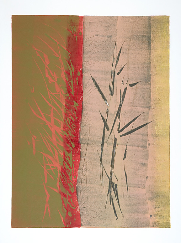Artist’s Statement: These monotypes were created in single passes through the press using the viscosity technique, in which inks of varying thickness resist each other on the plate. The textures and juxtapositions of color that result from this commingling of inks are rich and organic, dense yet breathing, like those found in nature. The images that emerge in the process are often landscapes, both figural and abstract, arising like dreams out of some deep reservoir of memory and experience distilled to their essences. The specific details of the place or object is not what is remembered; what arises is a feeling—of immutable nature, of vastness and distance, of the movement of air and wind, of heat and cold and silence, of the breathing of plants and water and stone.