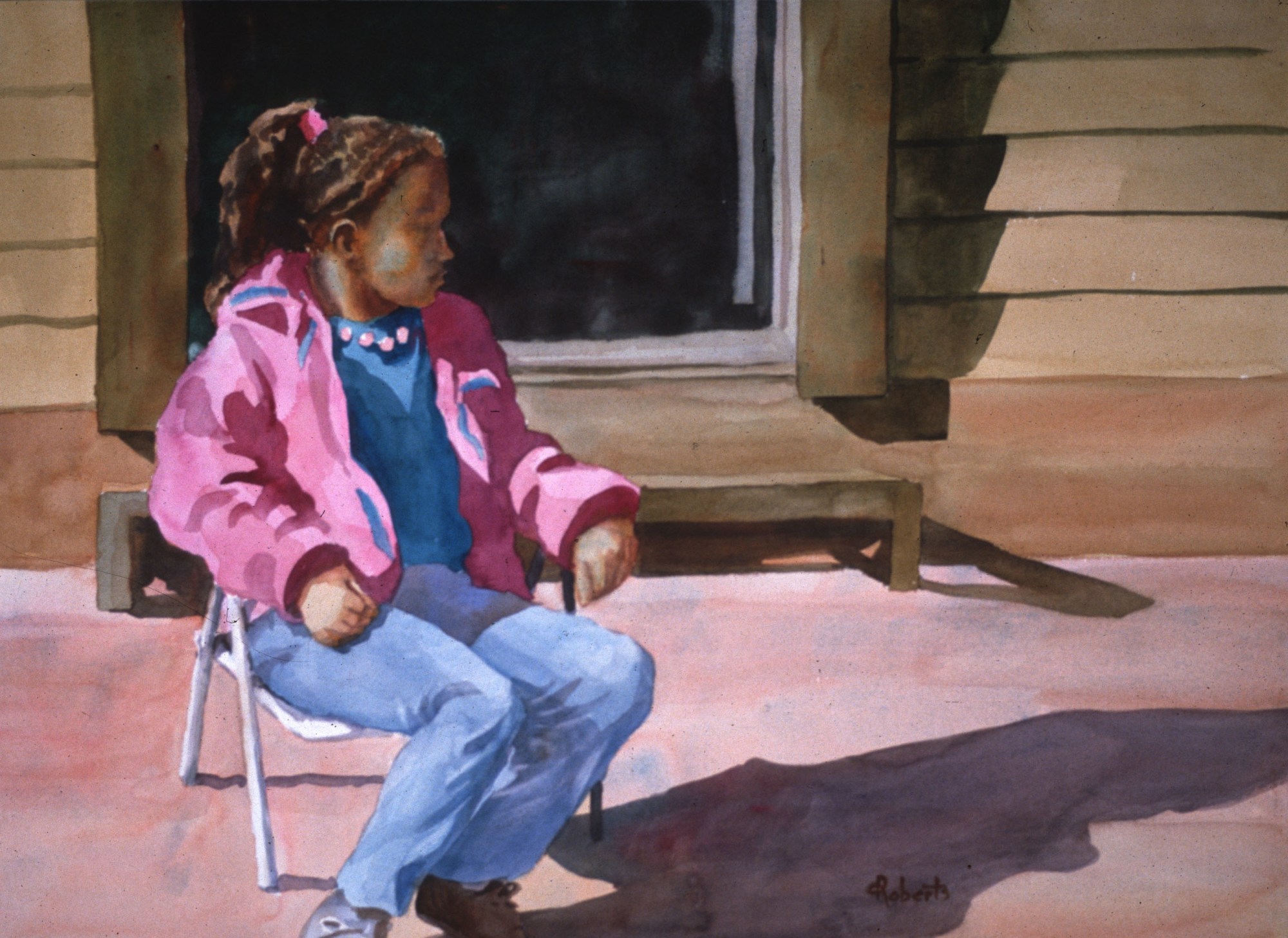 The young girl in Waiting was waiting for her parents to pack up and leave their vacation cabin in Yosemite. She had been told to sit still and not get in the way. Fortunately, the girl was entranced by a group of artists who were painting nearby. She sat relatively still for a nine year-old, so I was able to make a sketch and take enough photographs to complete a painting. The strong horizontal format gives the scene a sense of calmness. The major compositional lines of two strong verticals and one horizontal add to the peacefulness of the scene. The open door forms a frame for the head of the girl, emphasizing her importance.