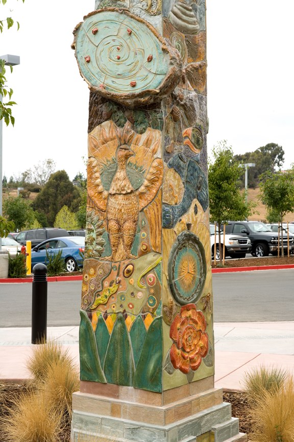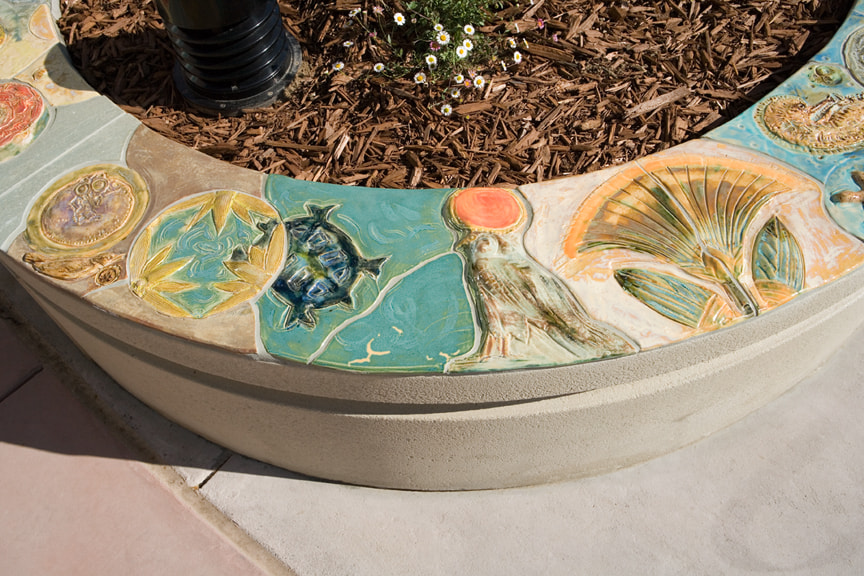 Artist's Statement: The purpose of the Possibilities: Tree of Life Gateway and the Hope: Destination Sculpture is to symbolically offer the viewer an alternative path in life, using universal symbols to talk about the similarities of the world's peoples at a time when much is made of our differences. Our goal was to create a sculptural environment that would beckon the visitor with inviting, colorful imagery that would also be accessible and engaging. The Gateway's focal point is the powerful life-giving force of the sun, and the Destination Sculpture celebrates the powerful life-giving force of water. Both pieces use life-affirming, uplifting symbols from nature — flowers, birds, and trees — to talk about life's passages. Both also have a reflective central “portal,” an opening that extends the piece beyond its concrete borders, symbolically leaving its meaning open to individual interpretation. This subject matter is in keeping with the rest of our sculptural work, which addresses the commonality of all life forms and, therefore, their inherent interdependence.