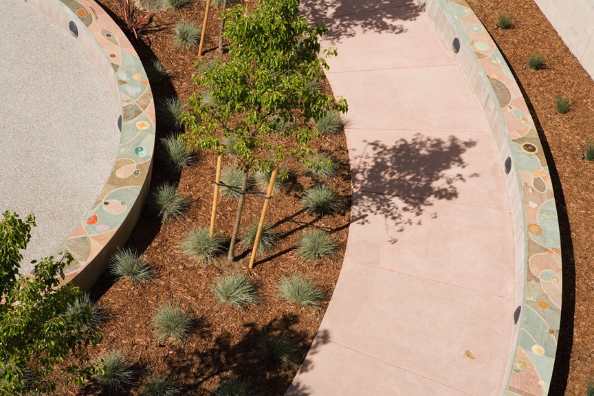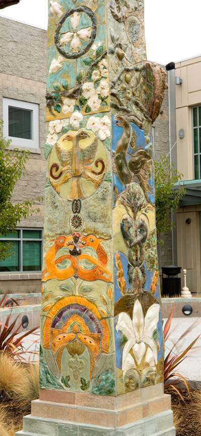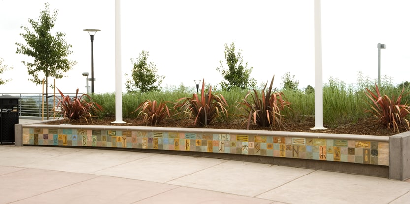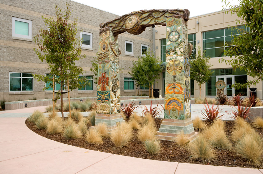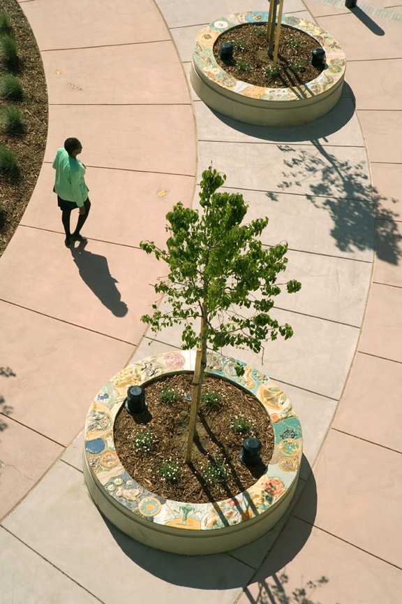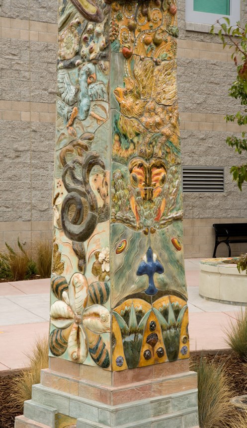 The Juvenile Justice Center Entry Plaza artwork is titled World Tree of Life. The plaza is the entry and exit point for all visitors to the facility. The artists designed and created the artwork placed throughout the courtyard. The interrelated components include two large sculptures plus handmade ceramic, slate and glass elements placed on three large seating walls, two tree rings, a low wall, and the courtyard walkway.