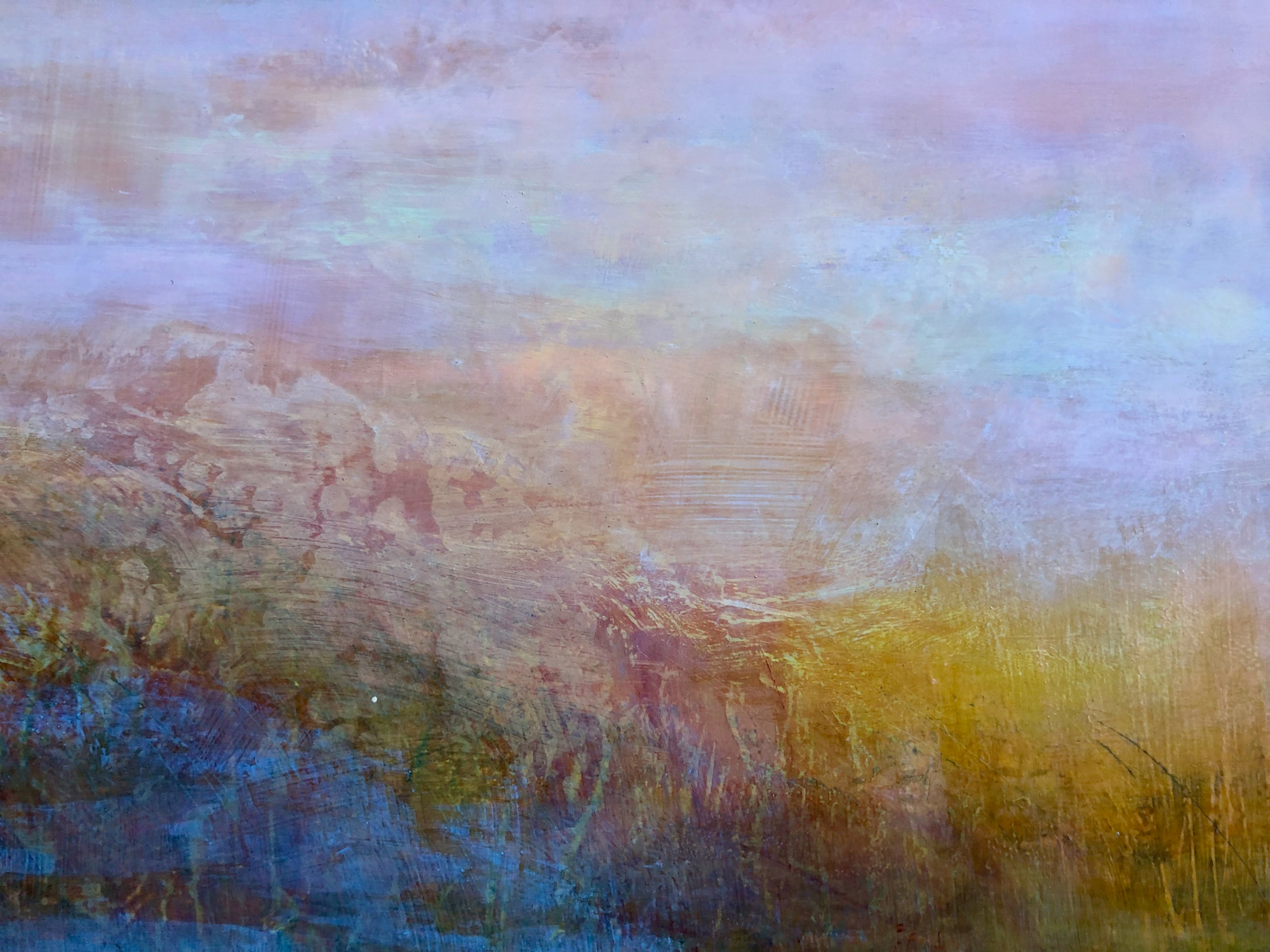 At one point it thought it was finished or nearly finished during open studios last year… but it wasn’t. So underneath this painting are about 5 others - they glow through the surface, concealed and somehow also present, like the echoes of previous lives and paths taken, not taken or explored and then recovered from.