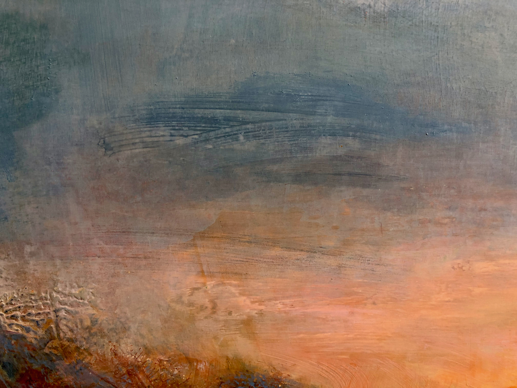 This painting began life in Blue Door Studio back in autumn 2023 or even 2022 when the gesso surface was prepared - 3 days morning and evening squeegie-ing cream like liquid over the sealed wood panel, leaving it to dry and sanding in between. After leaving Blue Door Studio it moved about (bedroom studio, University of Bedfordshire residency, new studio) and had various iterations.