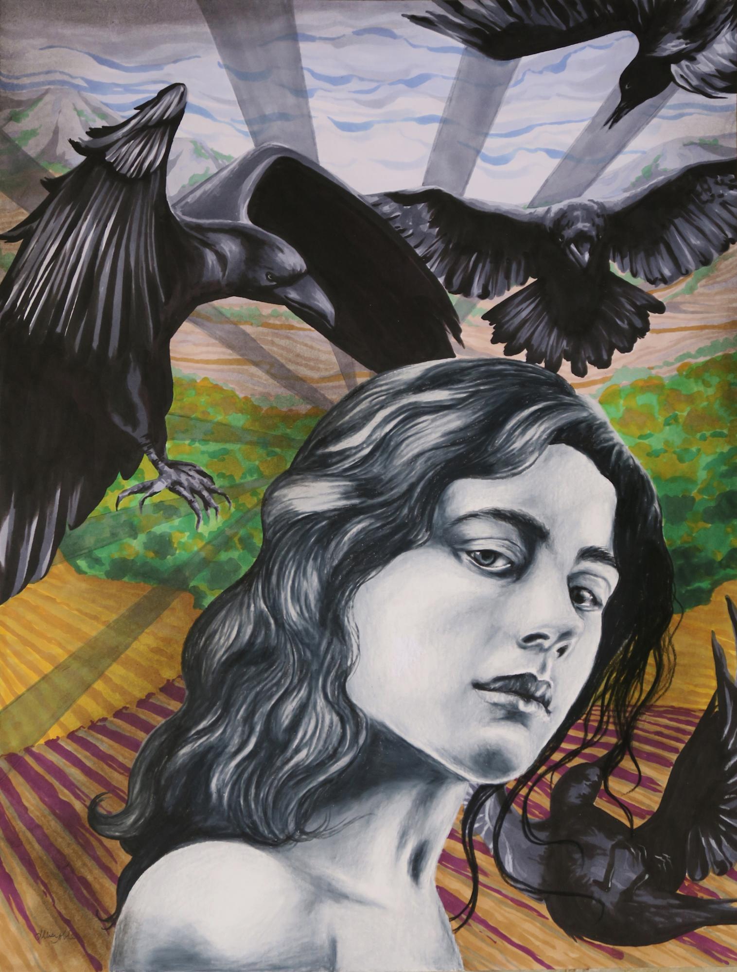 In “Flight Response”, the subject’s face is deliberately calm and expressionless while the birds flying around her appear fast and chaotic. Both she and the birds are done entirely in high contrast black and white to appear connected as one entity. They could be physical manifestations, or projections of the woman’s psyche. The background being almost opposite the woman and birds, a more expressionistic landscape in bright, peaceful colors, is also deliberate. There is hope, and there can always be better things ahead. Though not always aware of it, she is in control.