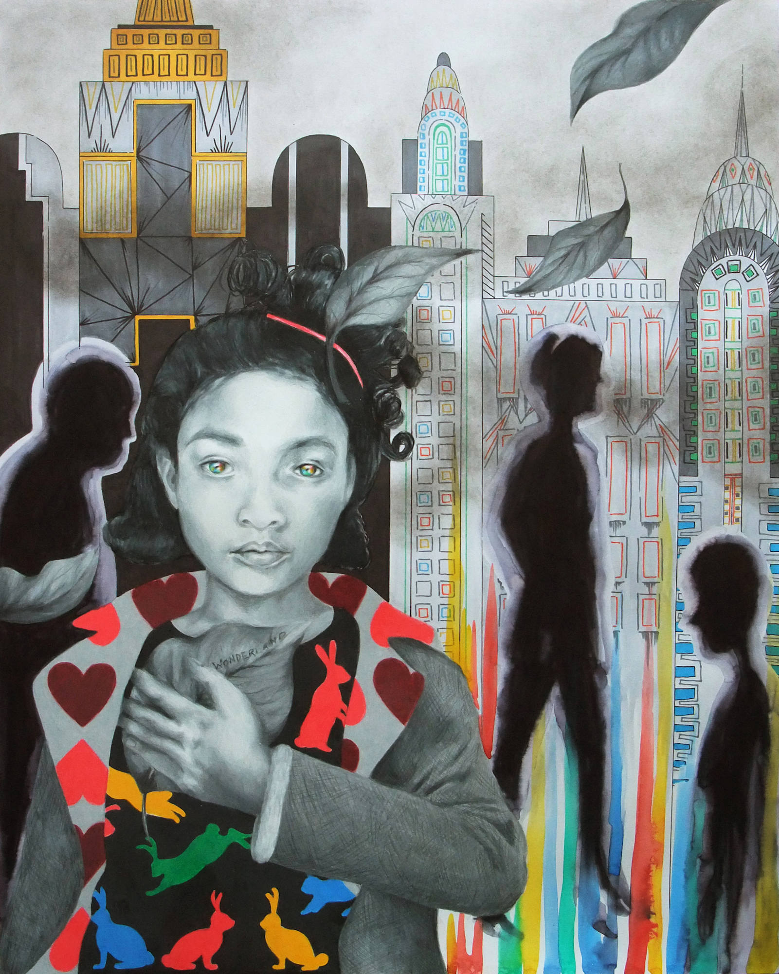 This is a rare piece in which my main subject is a child, and we are supposed to be seeing the world through her eyes. This is reinforced by the childlike accent colors, sketchy, at times "wobbly" outlines on the buildings, and the blurred people rushing past, fading into the scenery.