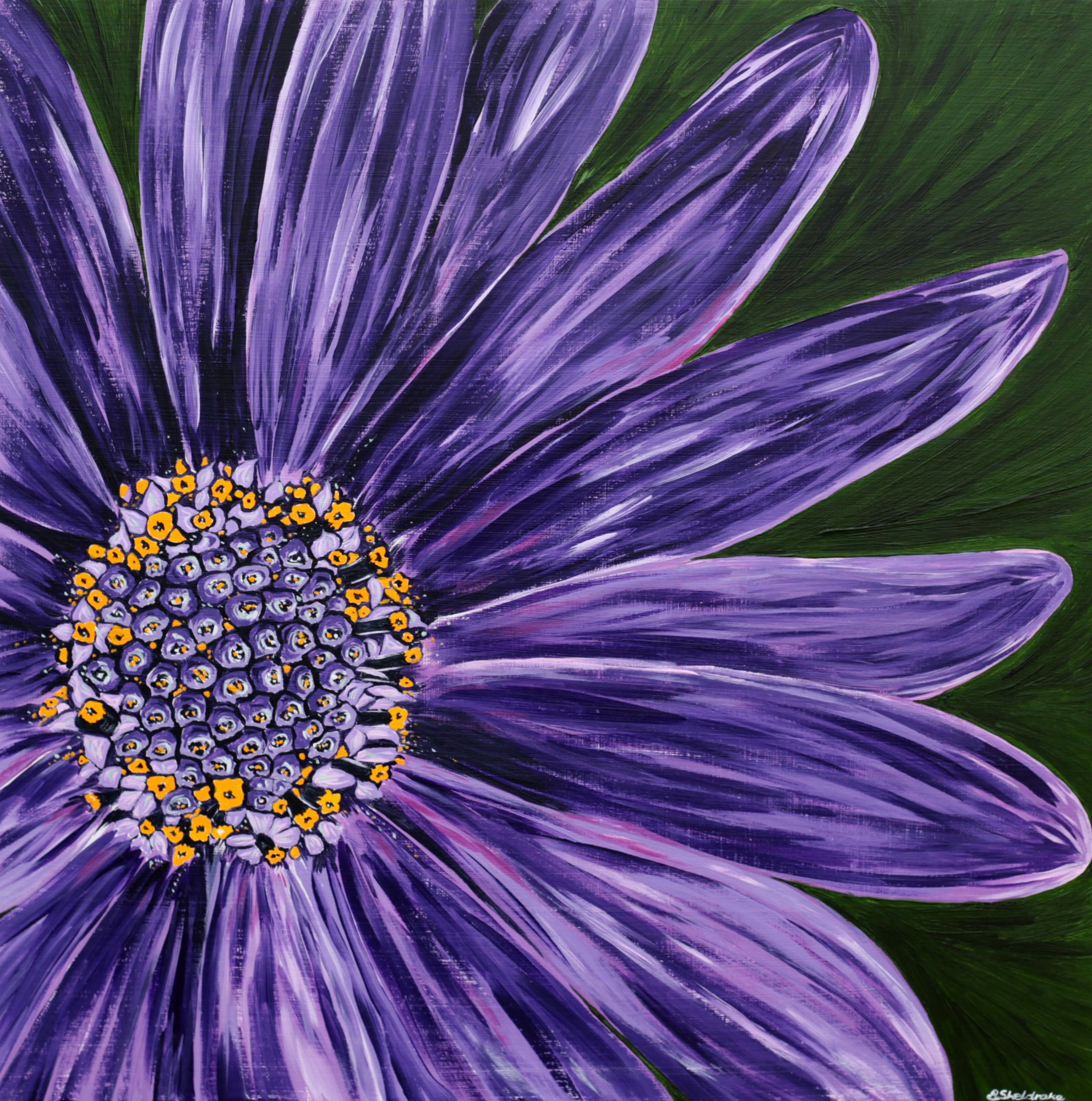 “The rich deep purple petals with their orange pollen were such a great contrast to paint on this daisy - and reminded me of the inky purple darkness that you sometimes see at night. I never tire of painting these enigmatic flowers with their detail and bright petals."