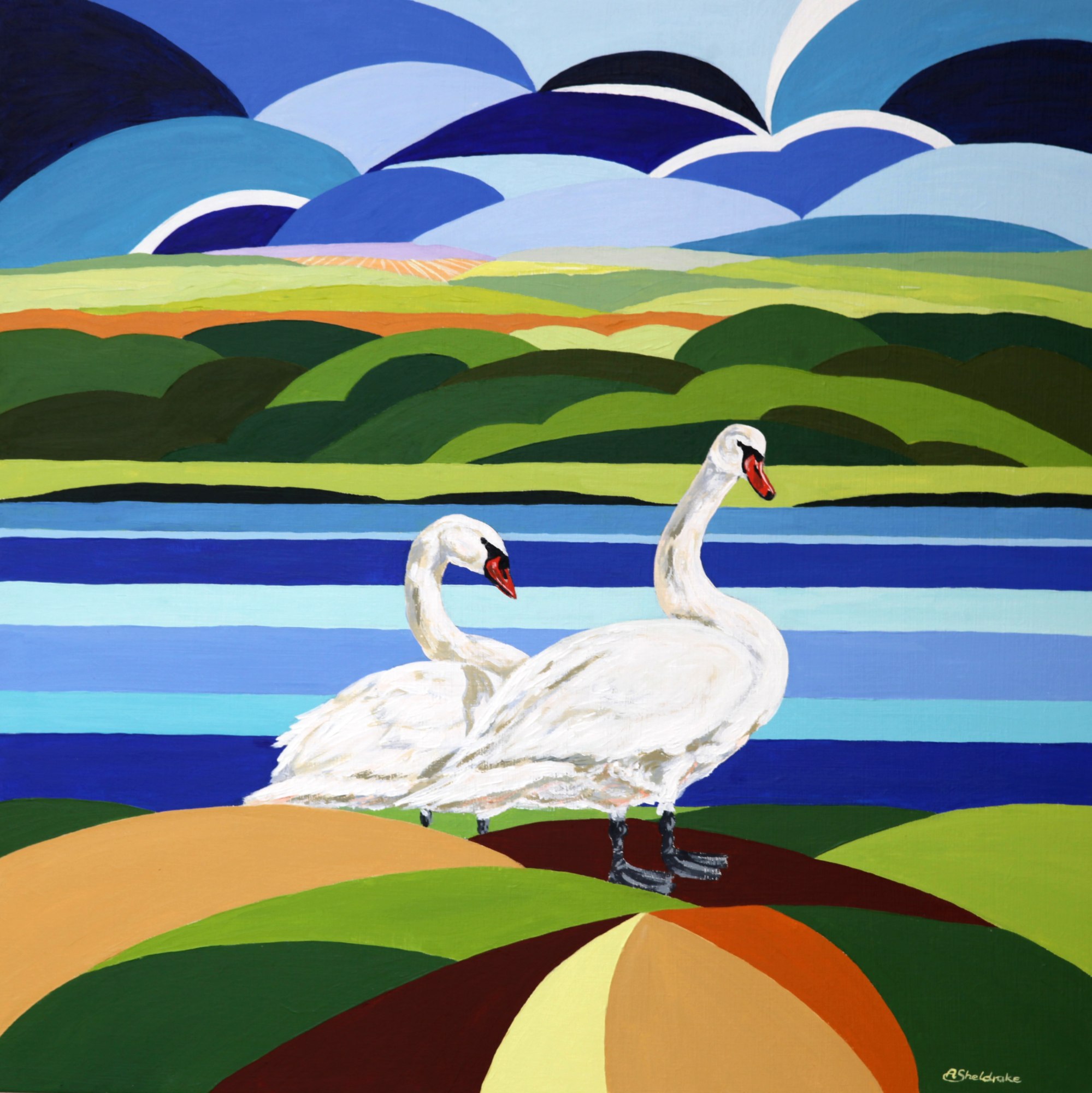 “Swans have always held a fascination for me – they are so regal and graceful – and seem to be watching you with an alert yet disdainful air – daring you to get too close! This couple seemed so at home together, and were great fun to paint.”