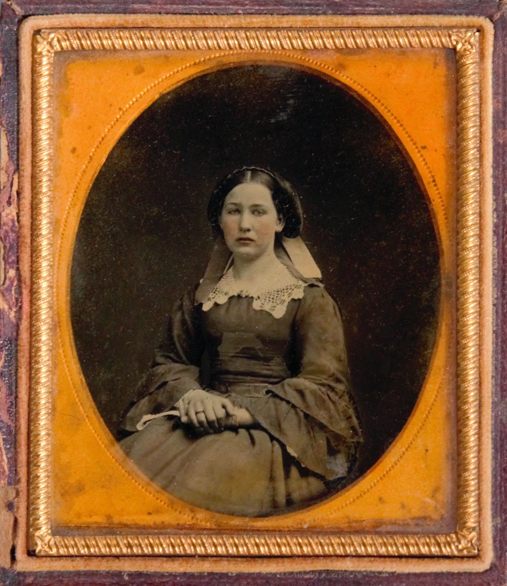 1/6 plate Cutting's patent ambrotype depicting a woman. Two layers of glass are adhered together with Canadian balsam, which provides a dimensional effect.