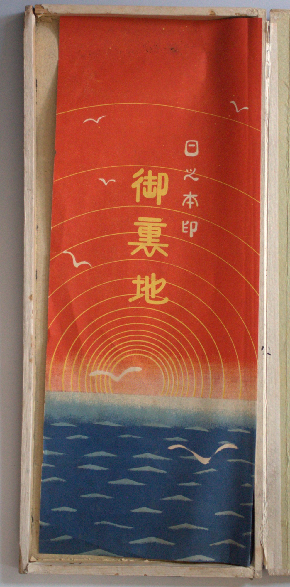 Showa period box intended to hold kimono lining fabric. Lid depicts a samurai.