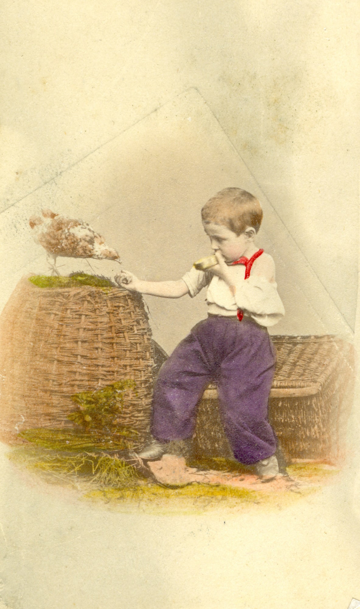 Depicts a boy with purple pants feeding a crust of bread to a chicken atop a basket.