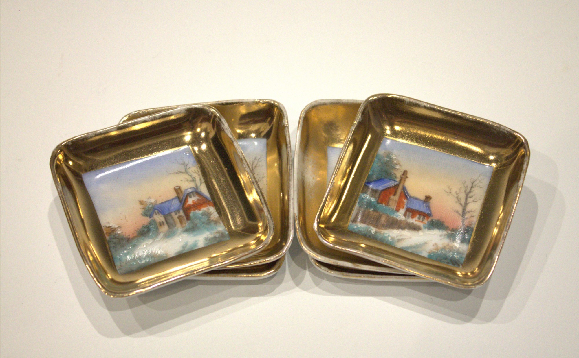 Set of six butter pat dishes depicting two winter landscape scenes.