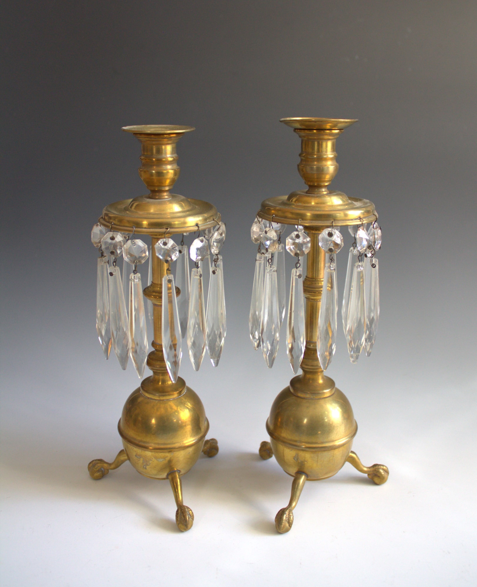 Pair of brass candlesticks with claw and ball feet and prisms.