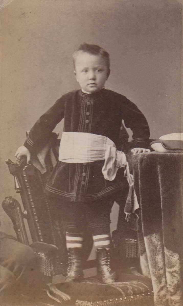 Depicts an unidentified little Zouave with a man's knees visible on the left side of image.
