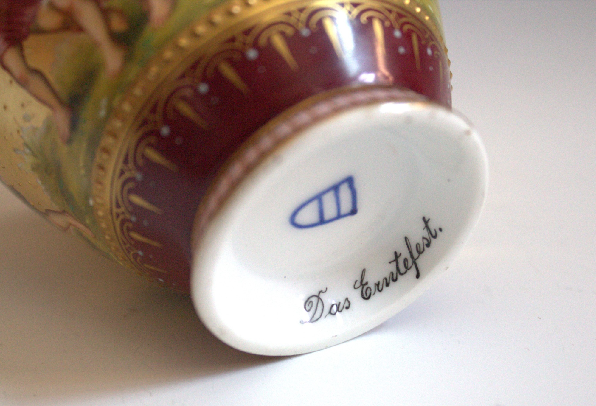 Cup and saucer depicting “Das Erntefest,” or harvest festival. Decorated and signed by A. Keer.