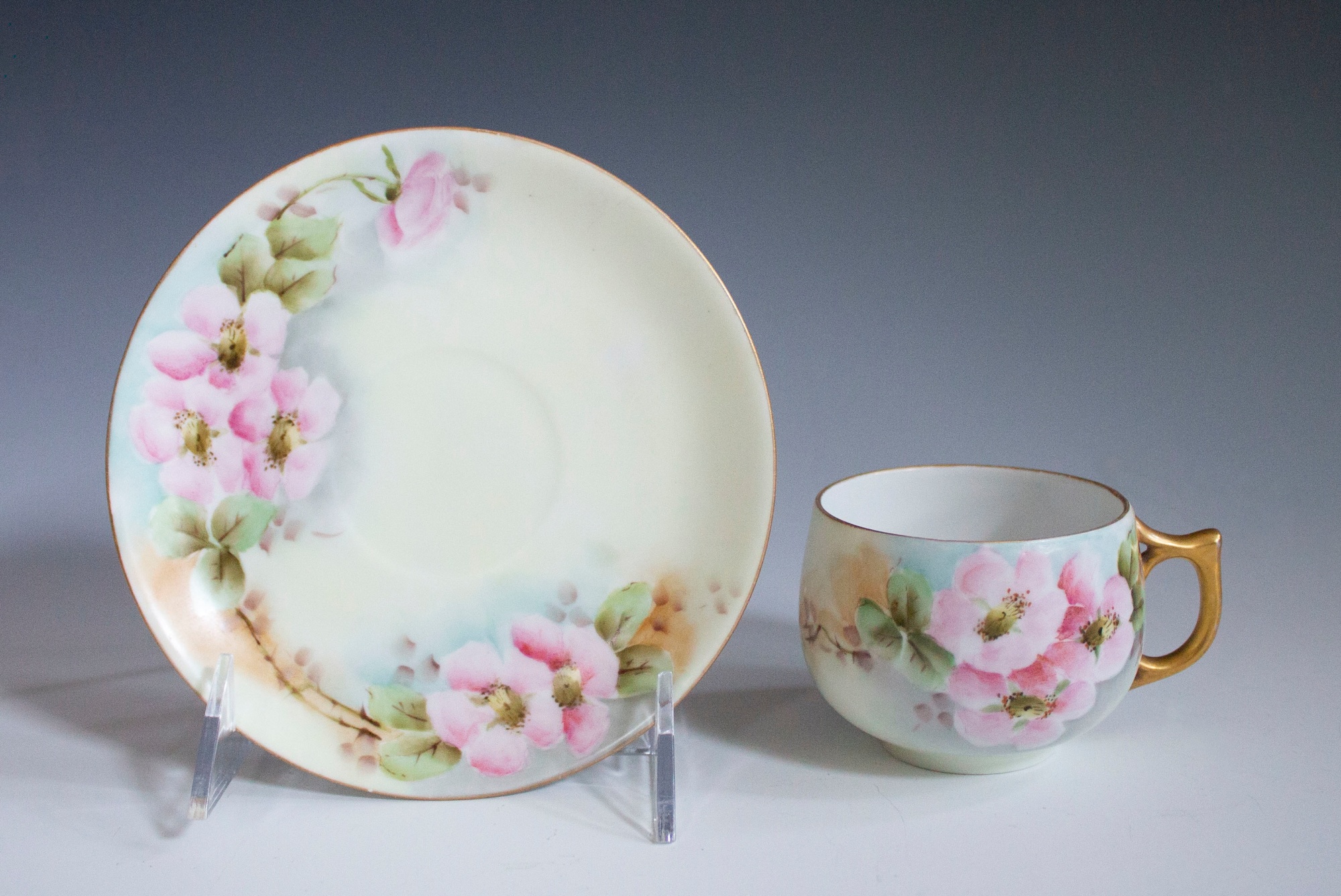 Cup and saucer with painted wild roses and gold edging.