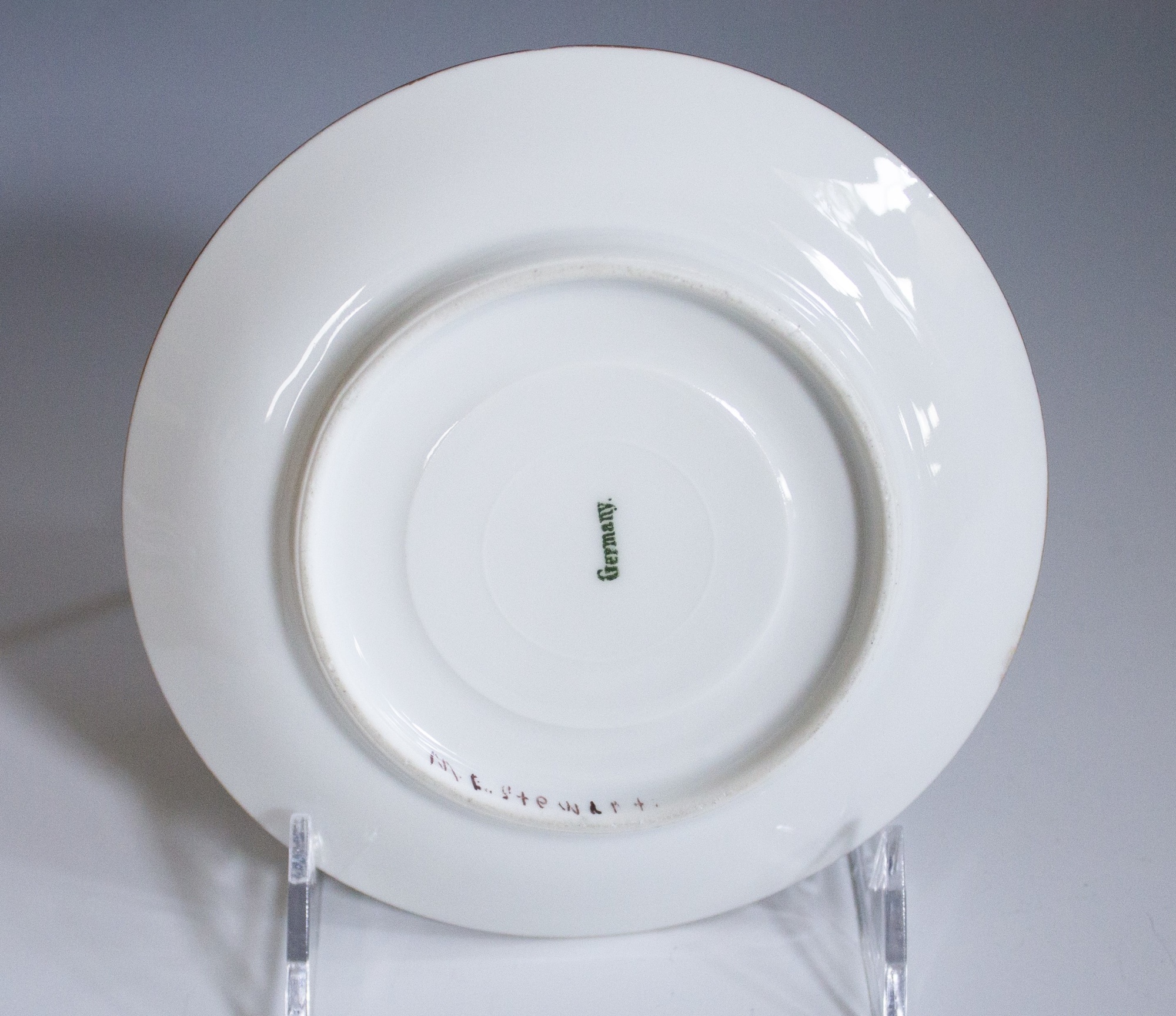 - Signature: Underside (stamped in green): 'Germany' Underside (painted): 'M.E. Stewart'