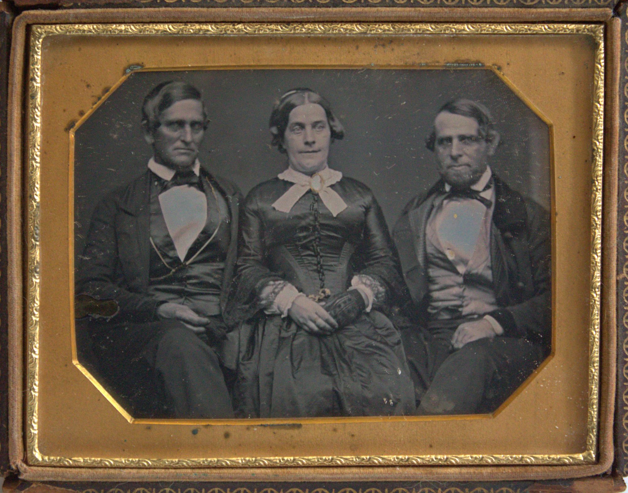 1/4 plate daguerreotype in horizontal format depicting a quizzical woman seated between two men.