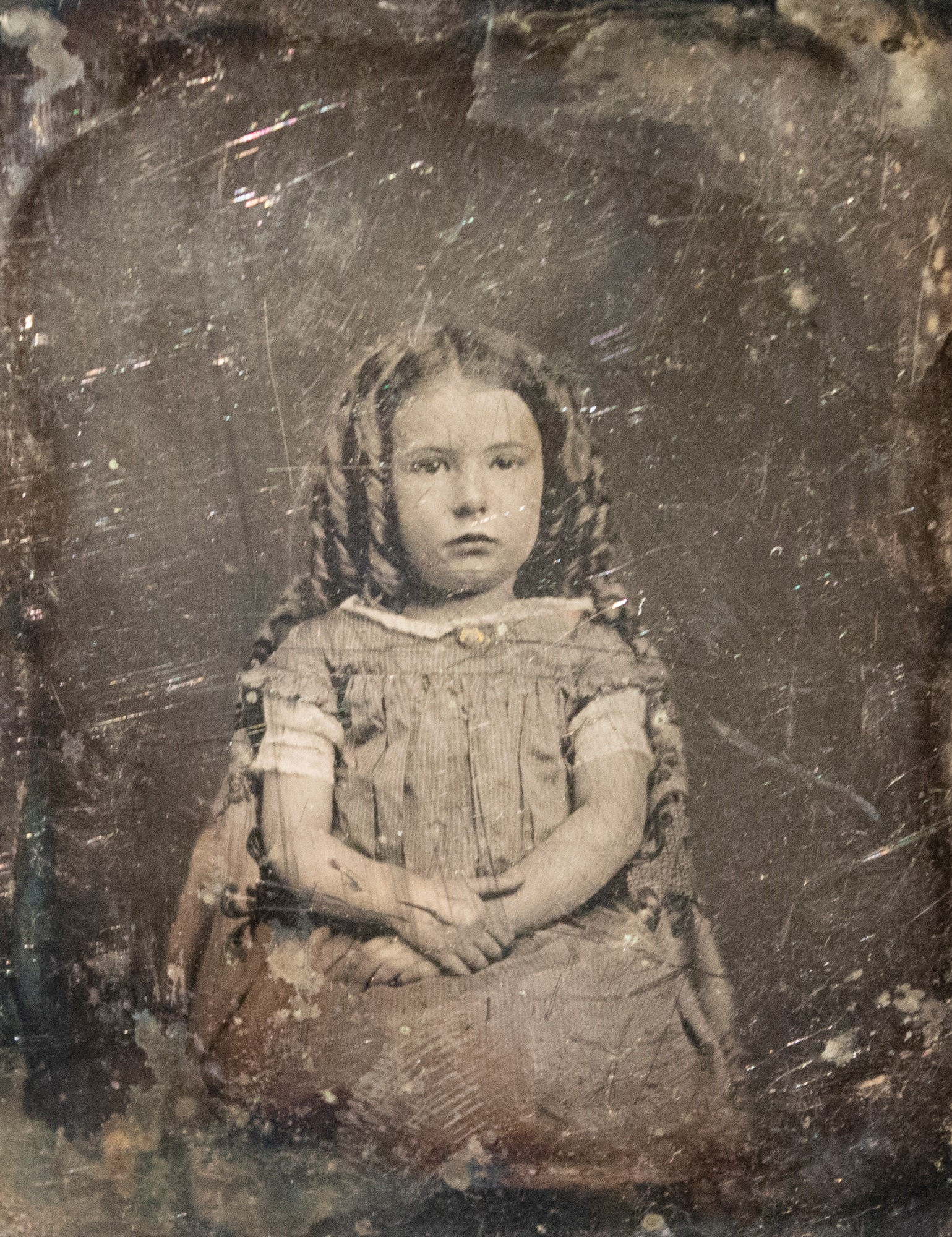 1/6 plate daguerreotype depicting a young seated girl with curly hair.