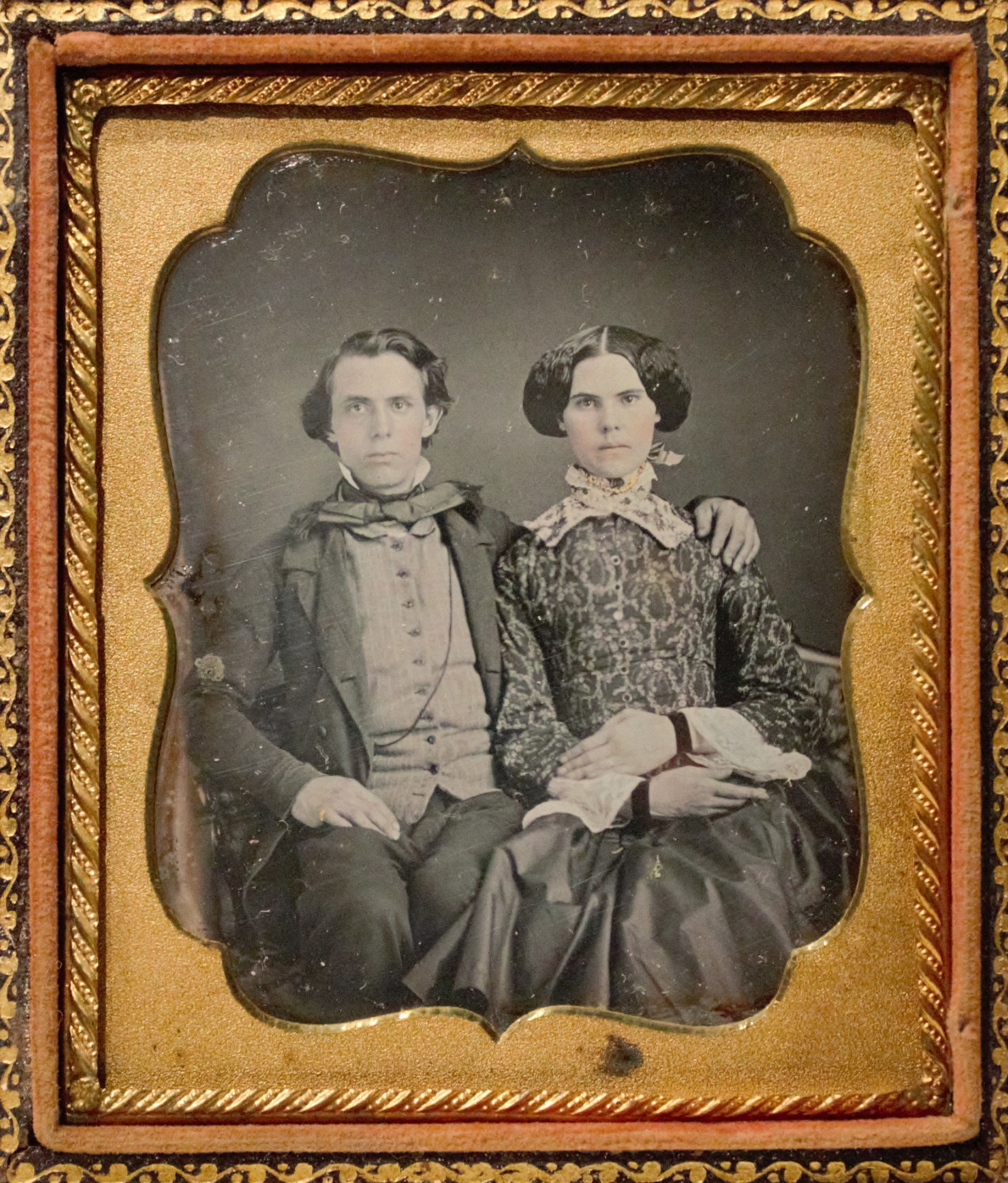 1/6 plate daguerreotype depicting a seated man and woman. Unidentified plate mark.