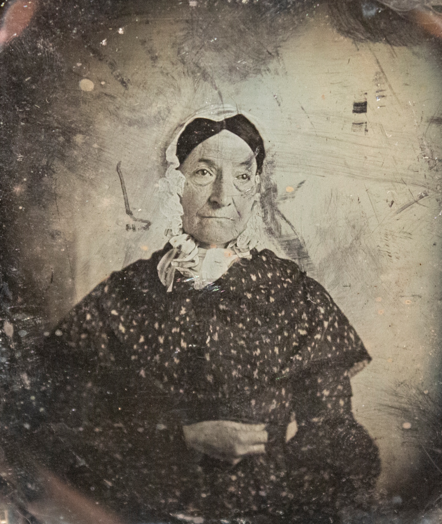 1/6 plate daguerreotype depicting a woman wearing a polka dot dress and bonnet. Plate supplied by a French maker, c.1847.