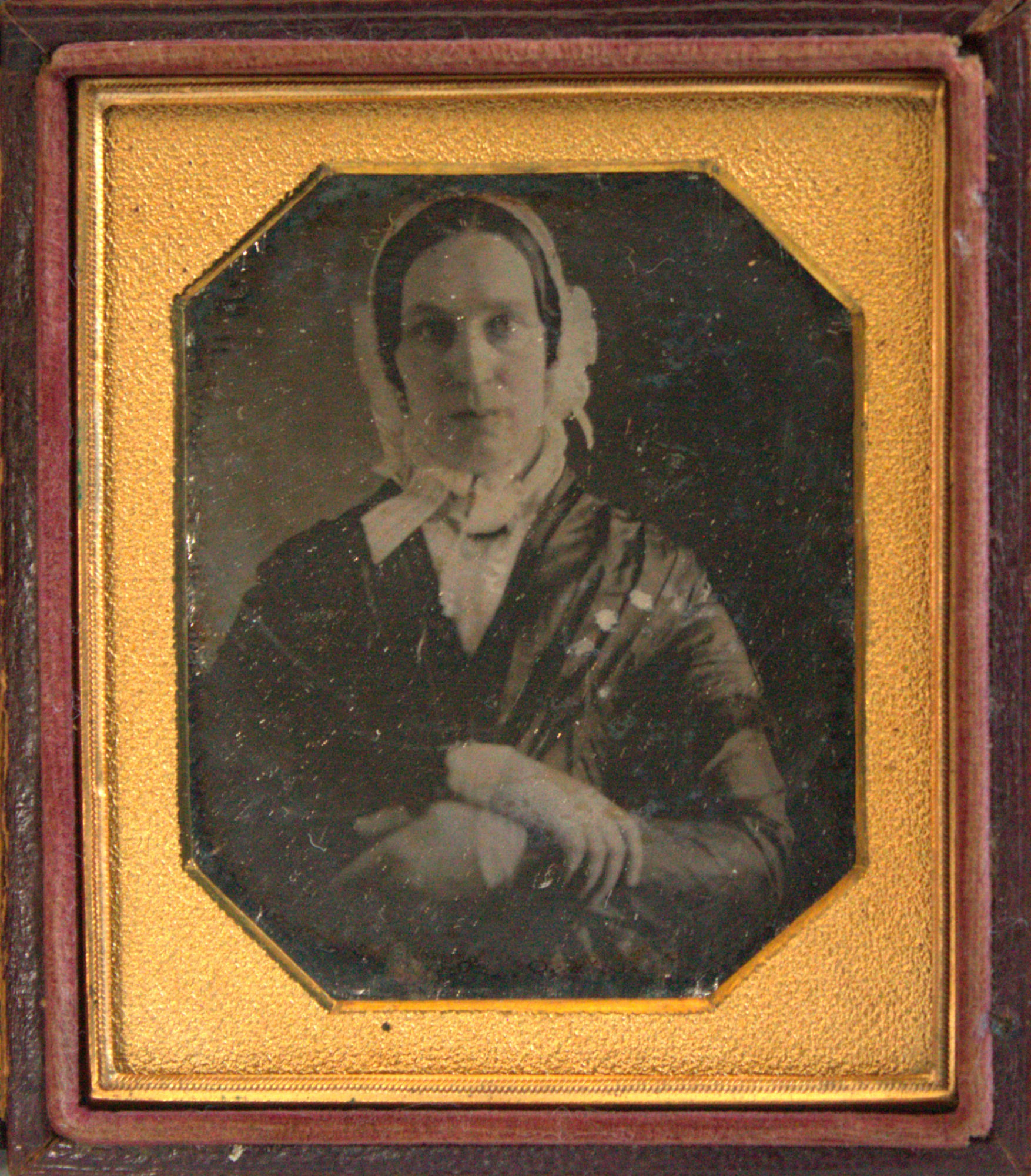 1/6 plate daguerreotype depicting a seated woman wearing a bonnet.