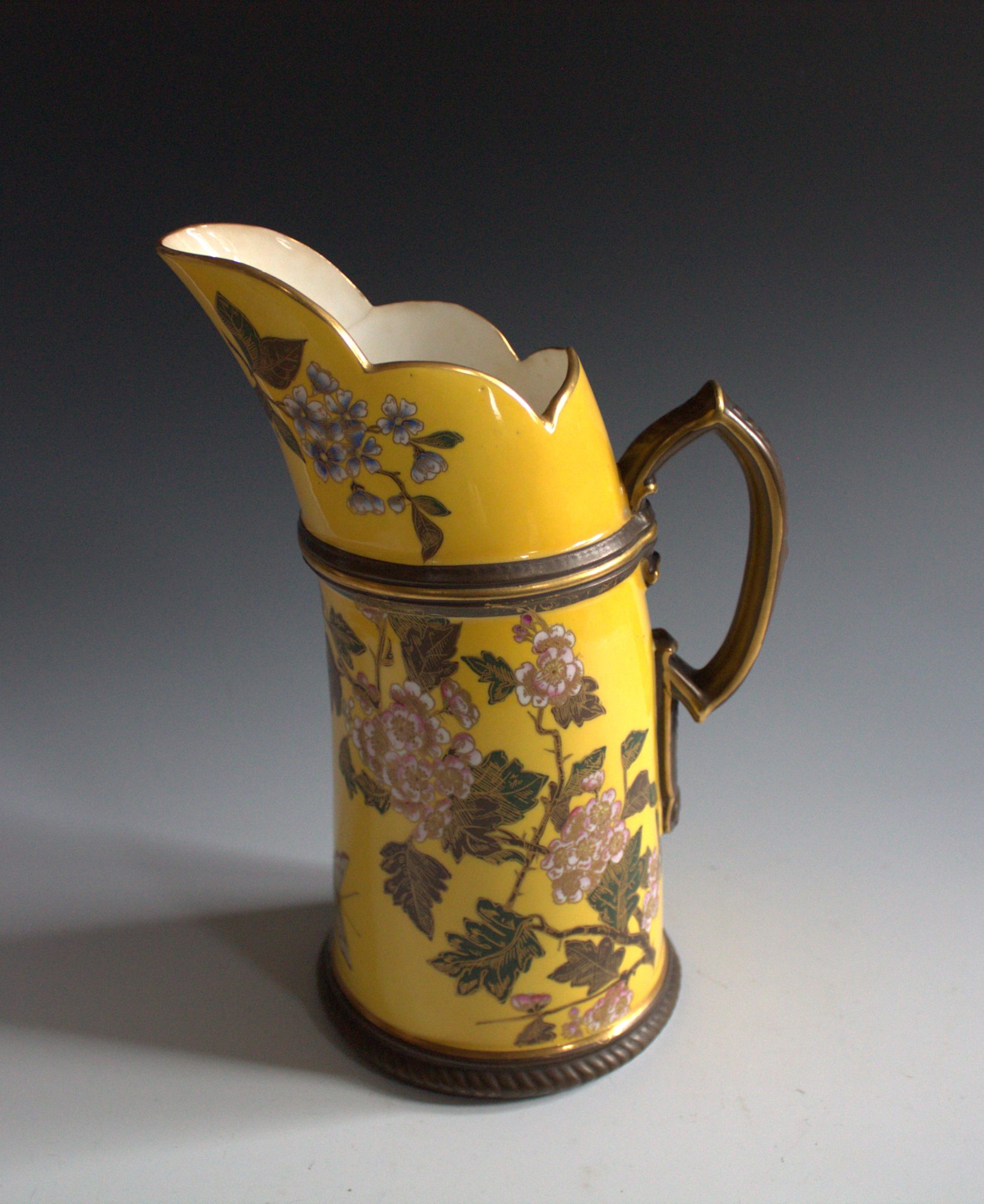 Aesthetic ewer with polychrome enamel decoration depicting flowers and butterflies. Retailed by Ovington Brothers, New York.