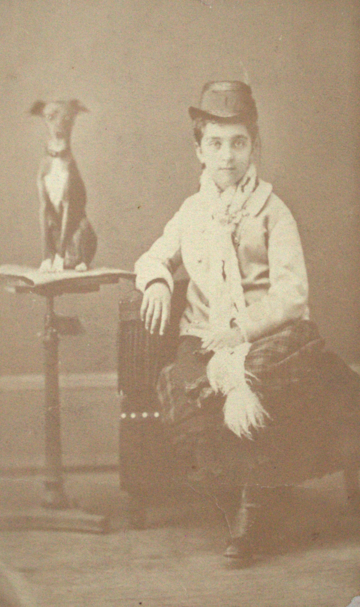 Carte de visite depicting a little girl with her dog sitting atop a photography stand.