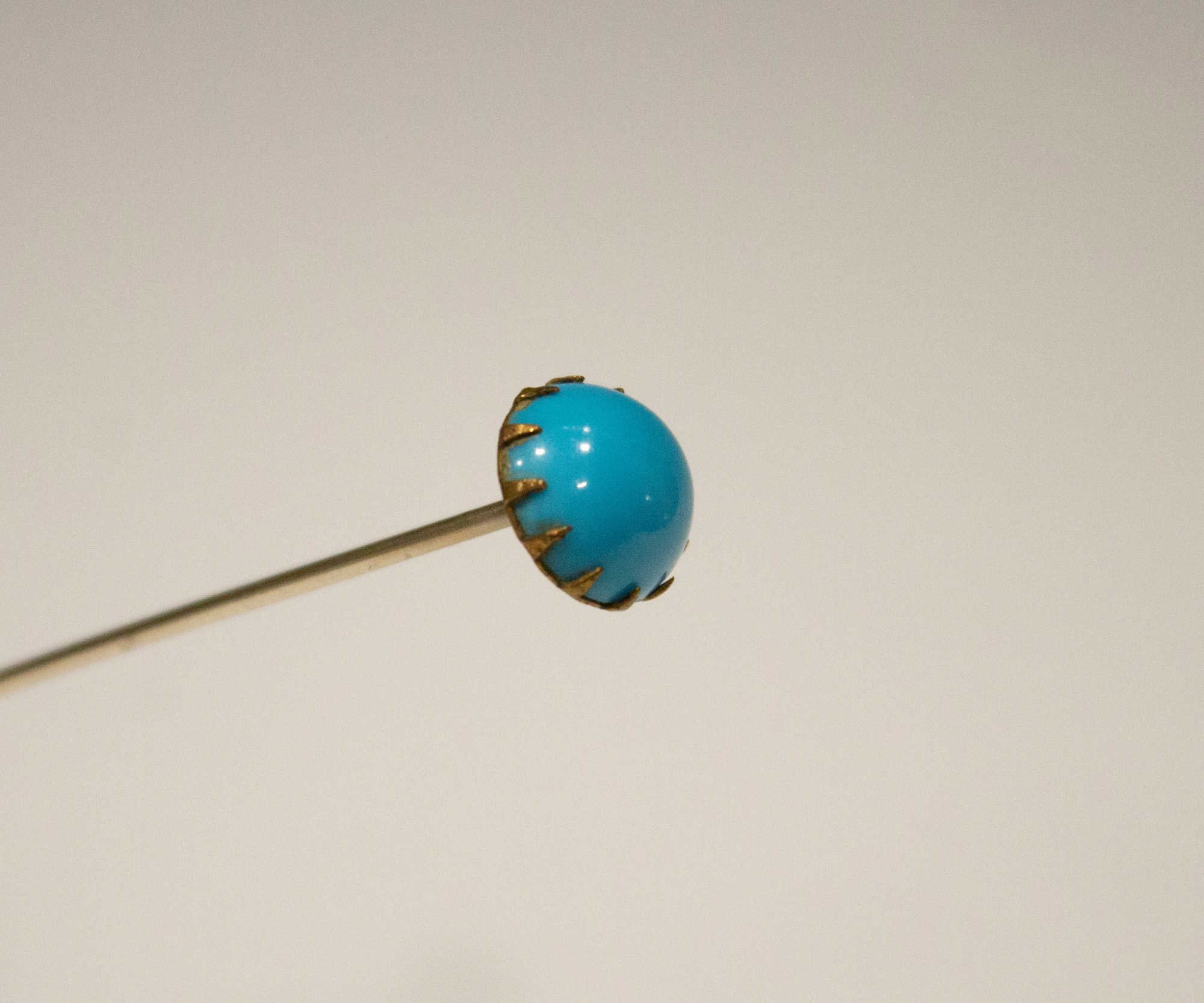Turquoise-colored glass hatpin with claw-shaped fastener.
