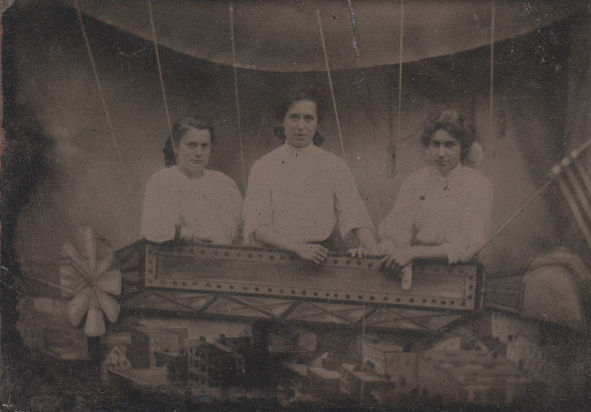 Tintype depicting three girls standing behind a prop hot air balloon over a cityscape.