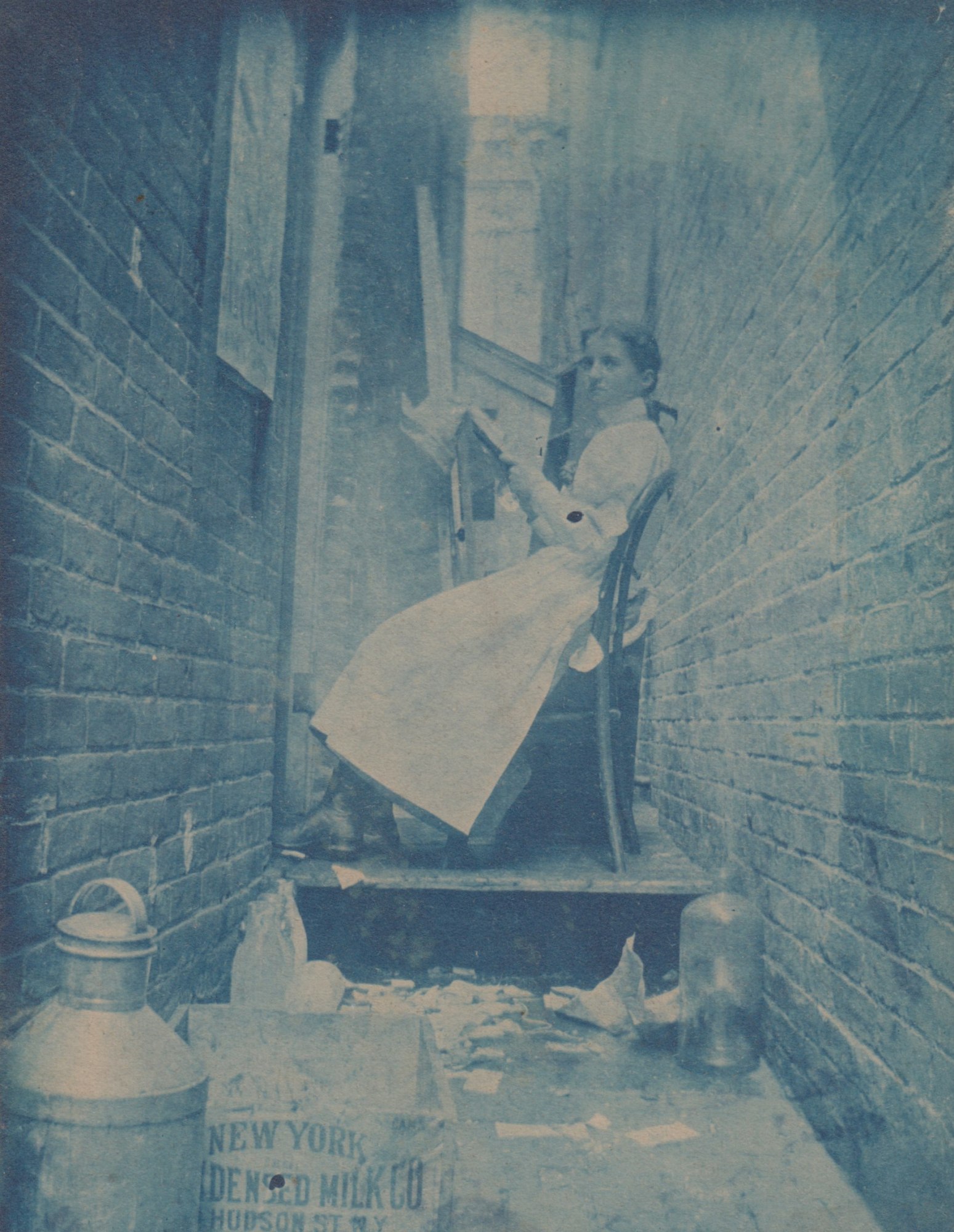 Depicts a young waitress sitting in an alley and reading a newspaper during her break.