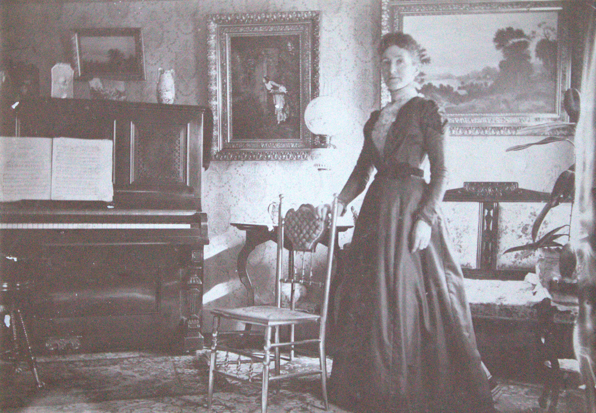 Depicts a woman standing in a parlor leaning on a chair near her piano.