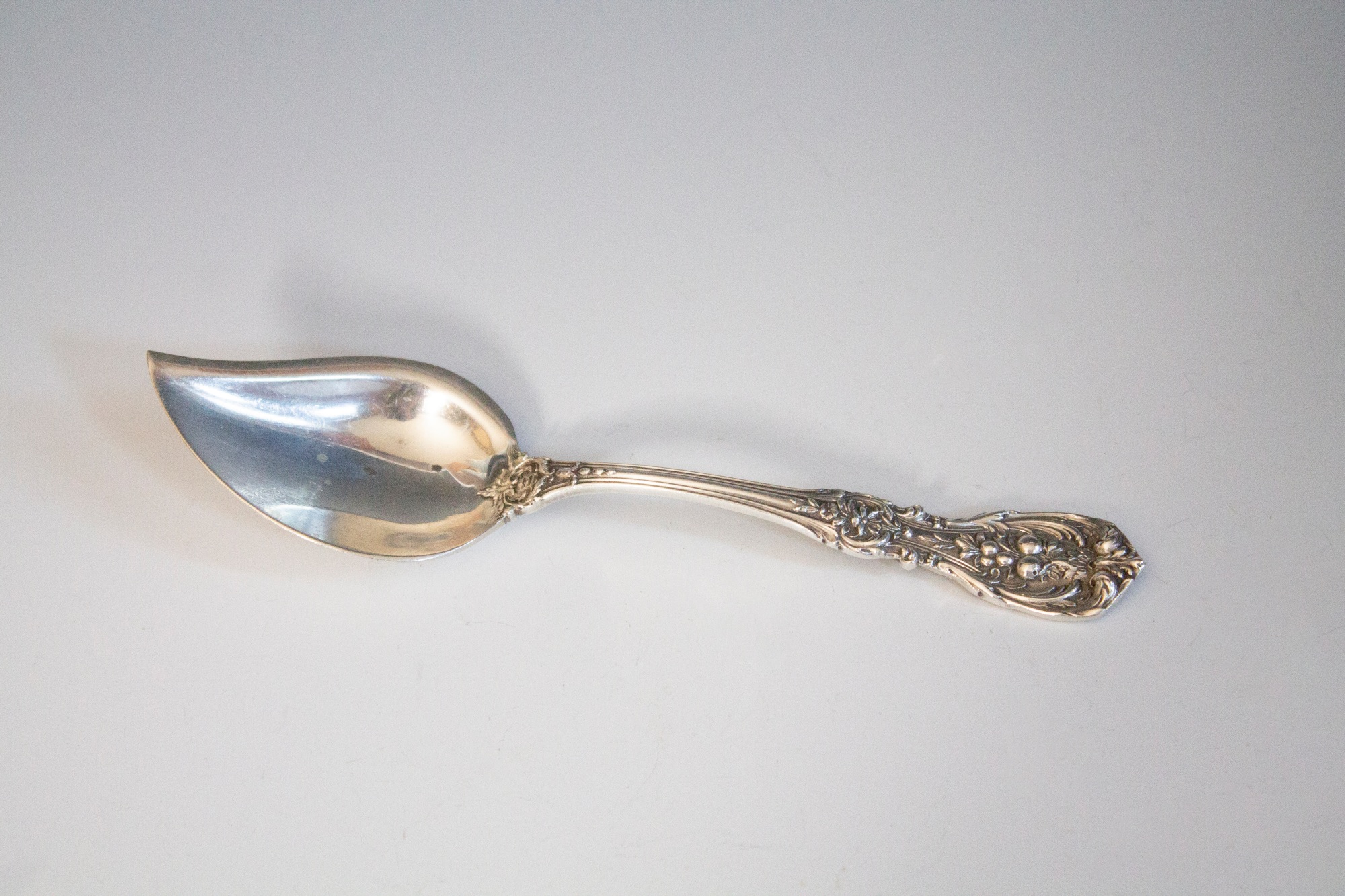 Sterling silver jelly server with fruit motif in the Francis pattern.