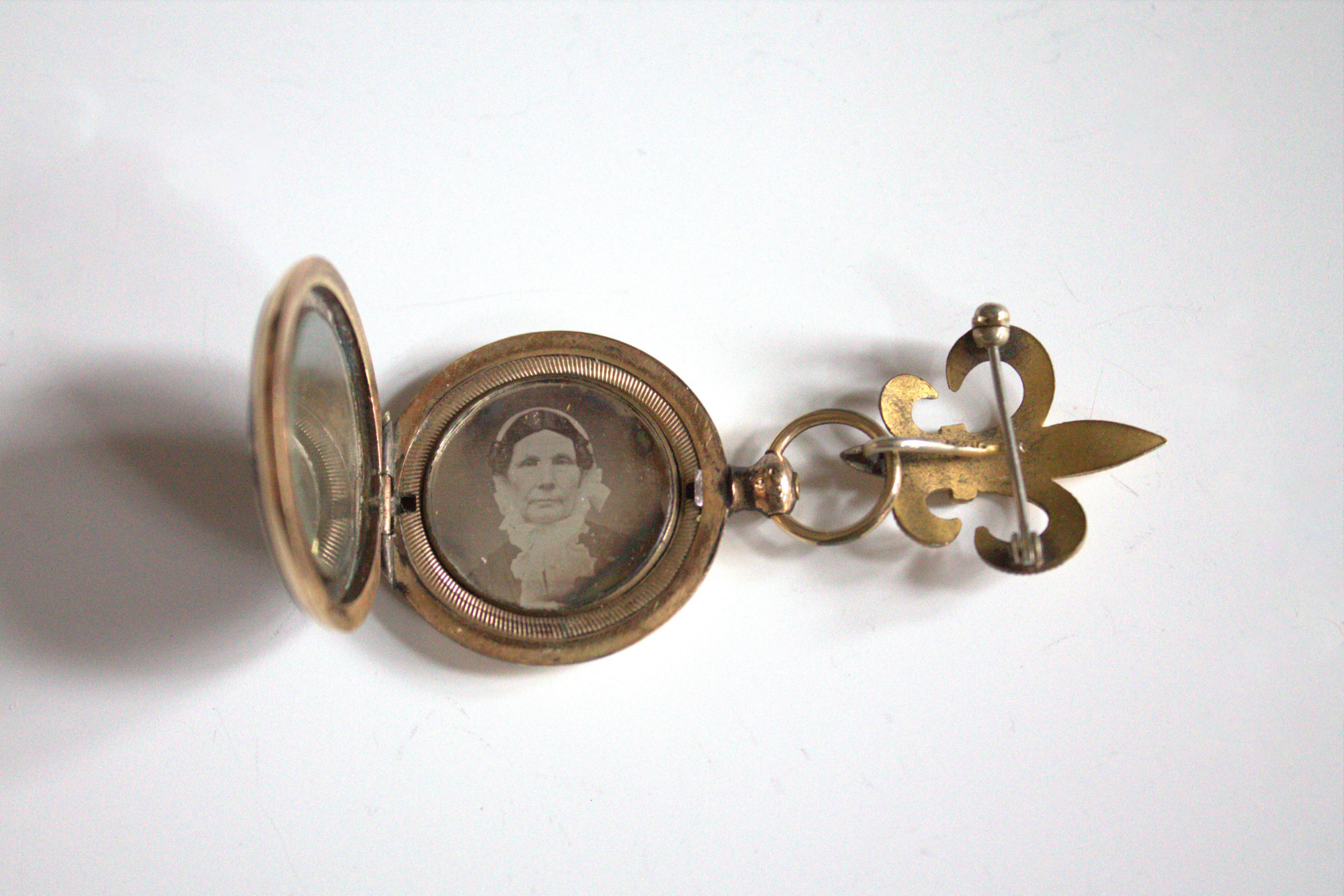 Gold-filled locket on fleur-de-lis vermeil fob containing a daguerreotype of a woman and a braided lock of hair.