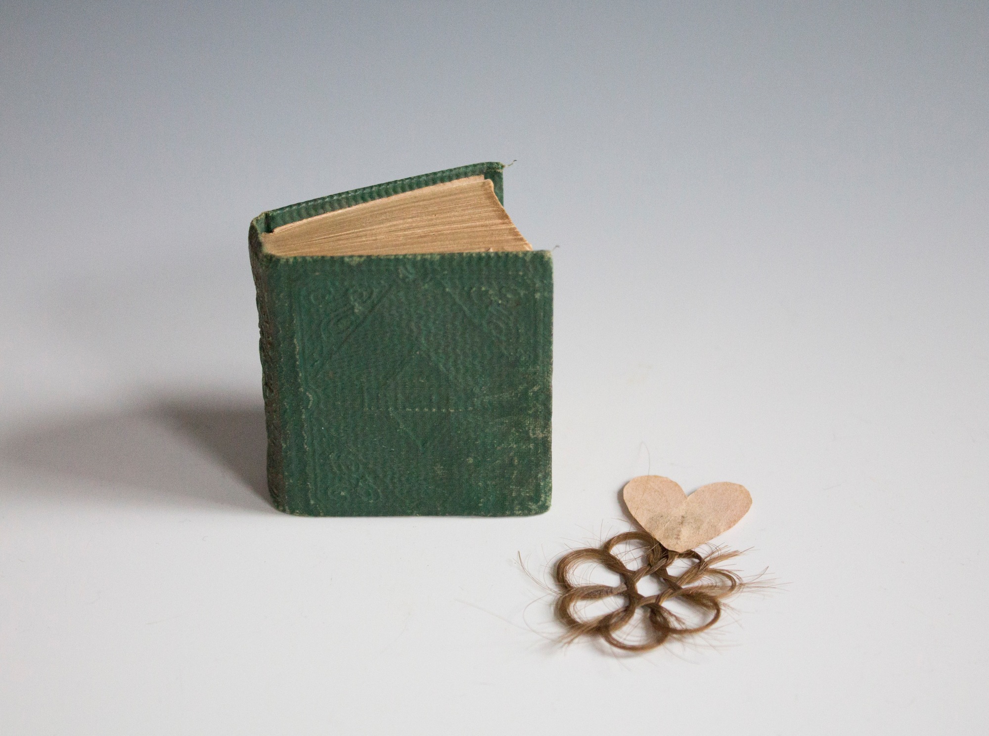 Miniature Bible from 1866 belonging to Ida Griffin (1860-1910), later Todd, of Middlefield, Otsego County, New York. The hair art is presumably hers and was made around the time she inscribed the book in 1868.