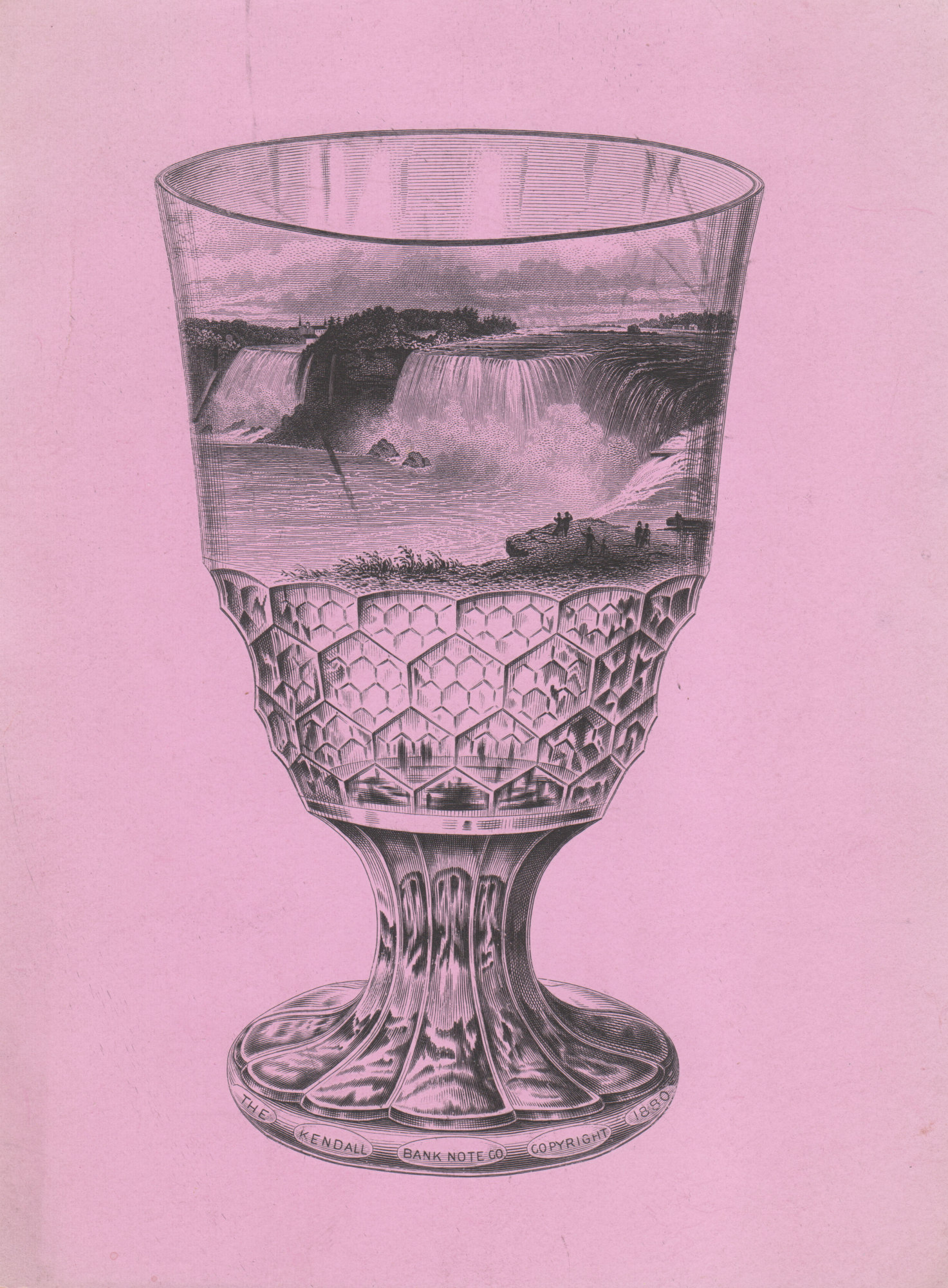 Engraving depicting a honeycomb flint glass goblet with a scene of Niagara Falls; advertisement for The Kendall Bank Note Co.
