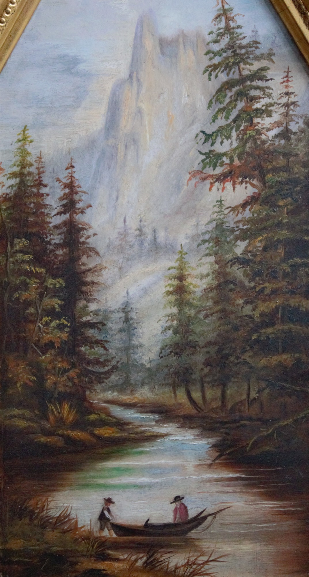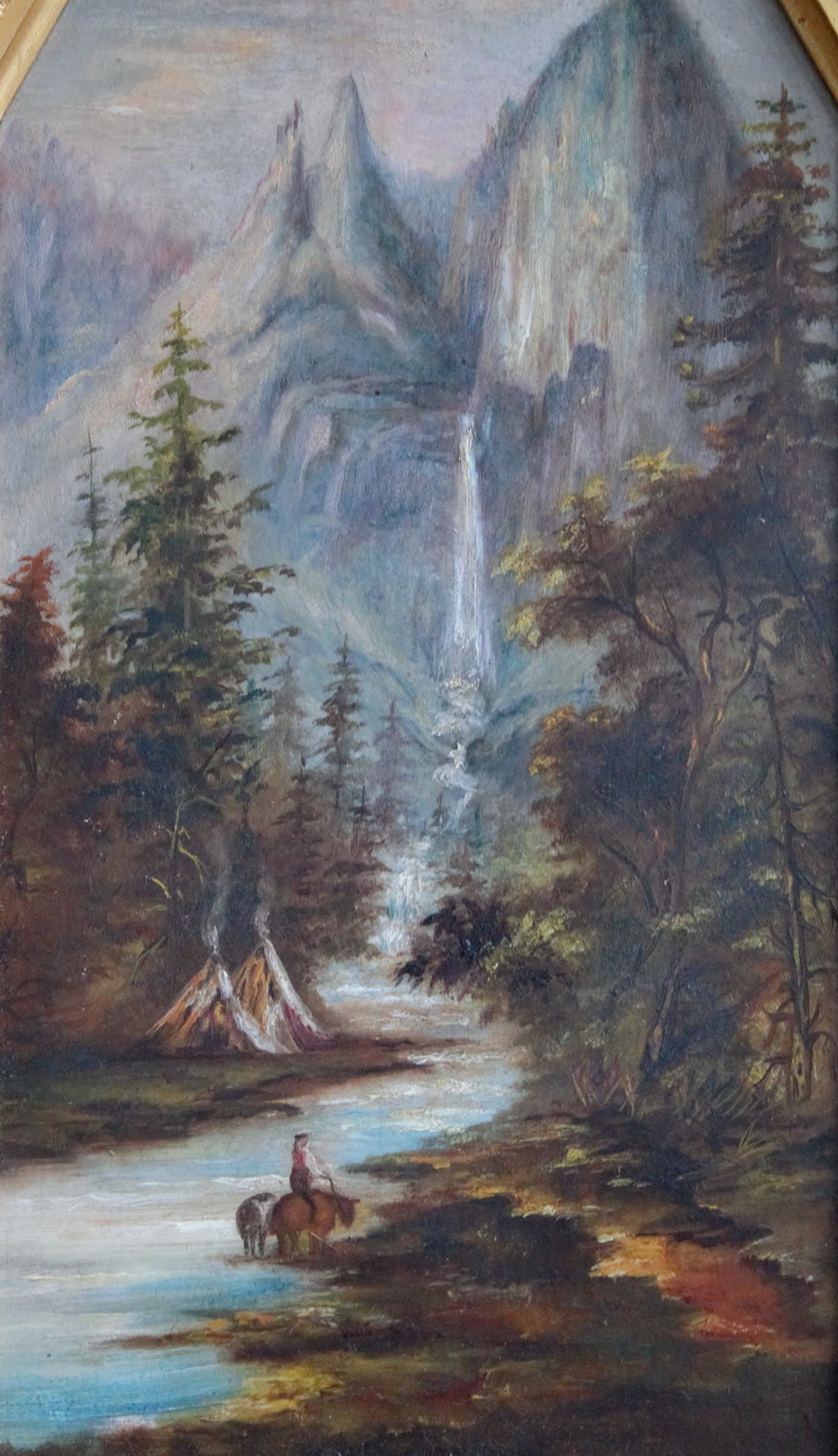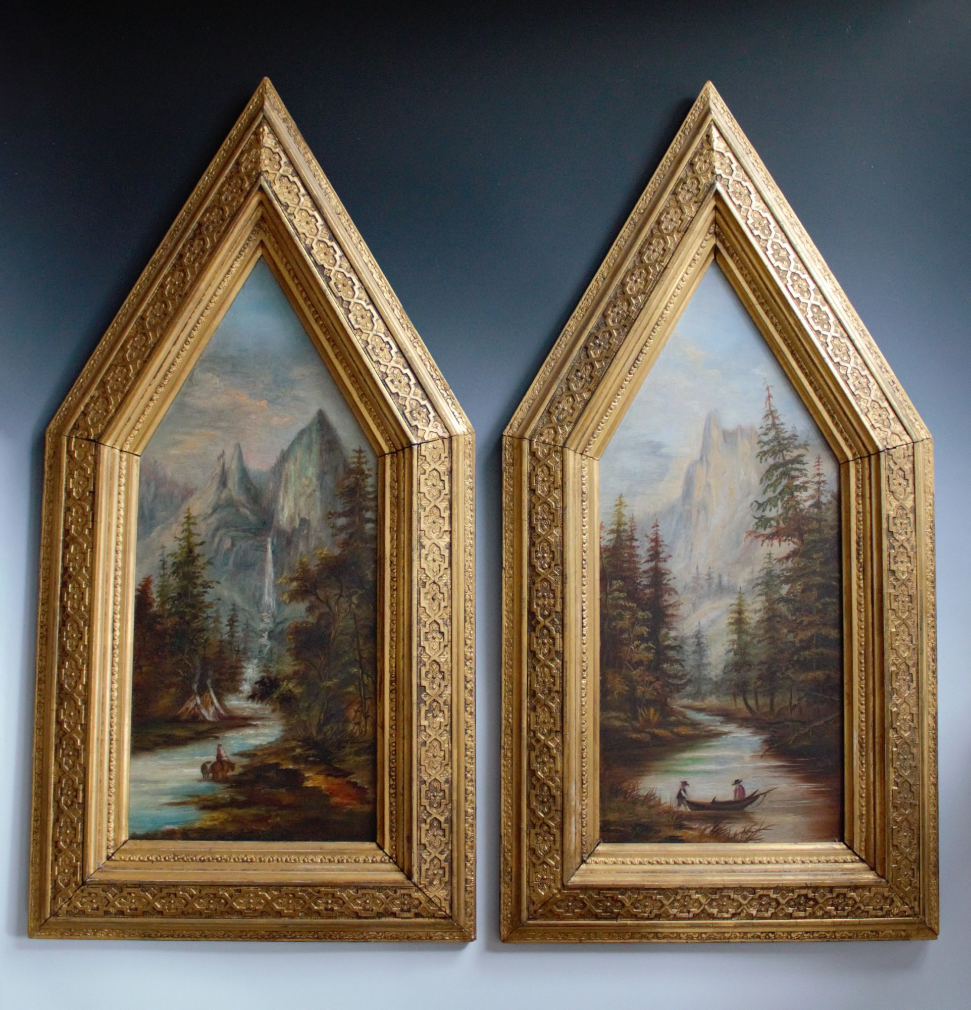 Pair of paintings depicting steep mountains, explorers, and teepees. Displayed in ornate cathedral-shaped frames.