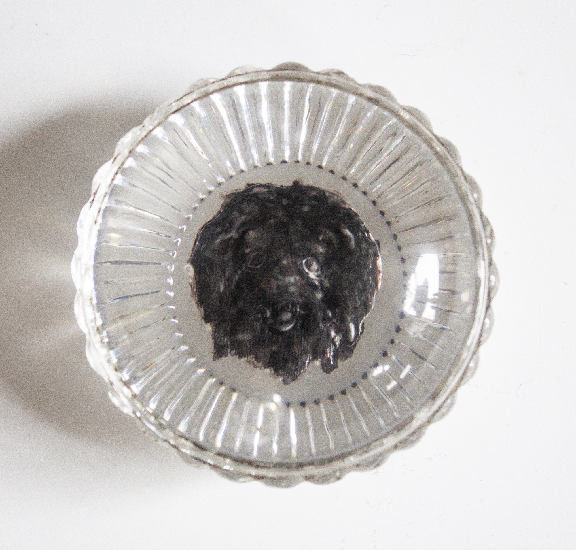 Intaglio paperweight with reverse-painted decoration depicting a brown fluffy dog.