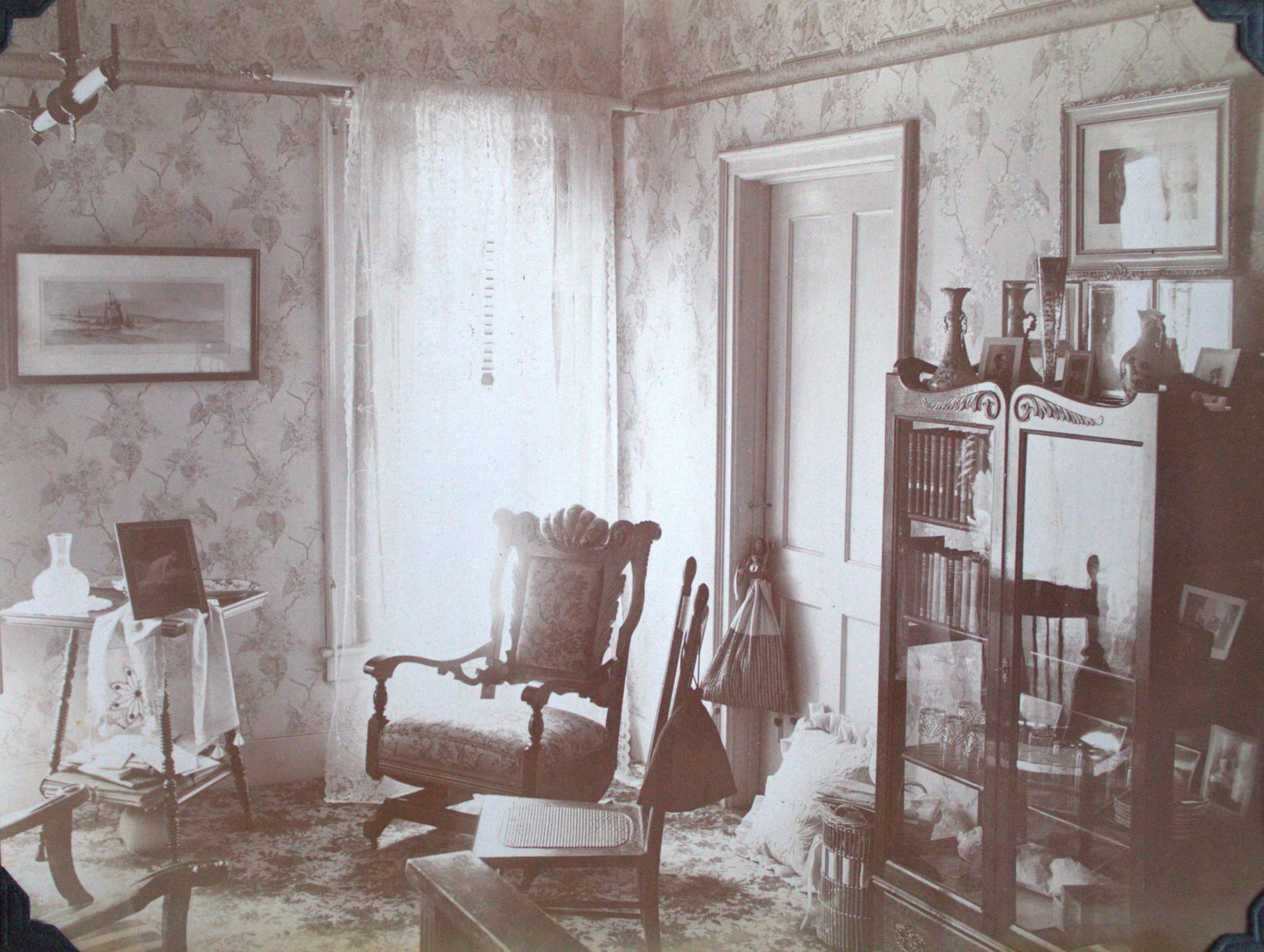 Parlor scene depicting chairs, a table, and bookcase with several decorative arts atop. Home might have belonged to the Wenner family of German Flatts, New York. Photo is mounted on a scrapbook page with three other remaining photos.